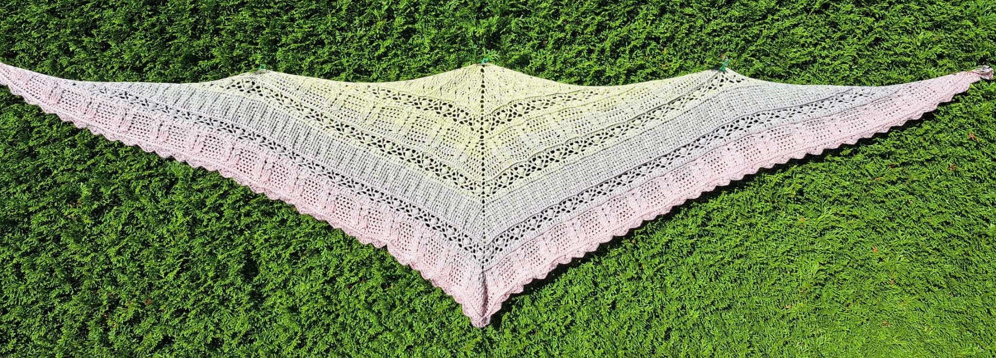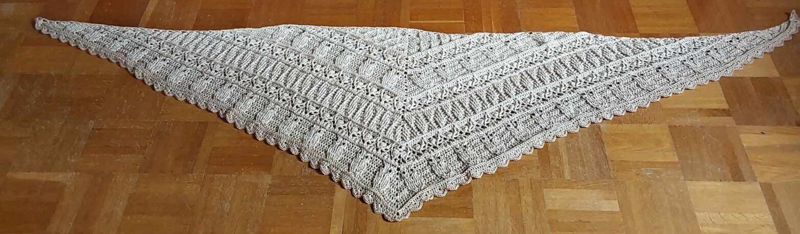 Das am Titelbild gezeigte Tuch hat folgende Abmessungen: 210 x 54 cm. Das Tuch enthält weitere Reihen, damit es noch größer gehäkelt werden kann. Bitte beachte, dass die Größe durch anderes Garn (zB 3fädig an Stelle von 4fädig) oder durch Verwendung einer anderen Häkelnadelstärke sehr stark abweichen kann.
