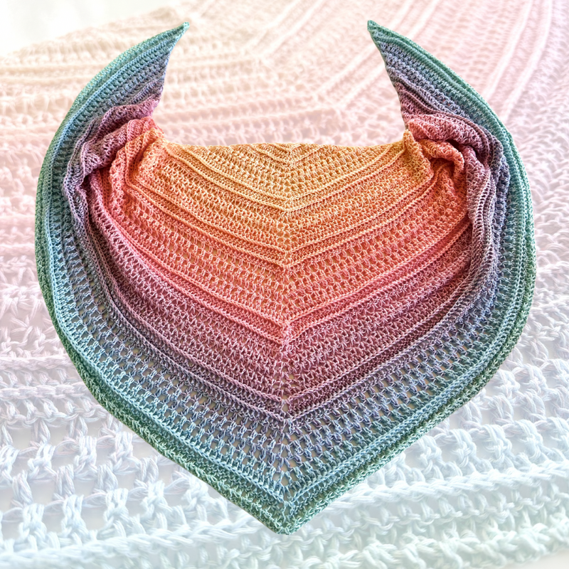 Dieses Dreieckstuch ist das perfekte Entspannungsprojekt. Sein Name steht für Entspannen und Häkeln, denn die Muster sind denkbar einfach und benötigen keine allzu große Konzentration, sorgen aber dennoch für genügend Abwechslung beim Häkeln, damit es nicht langweilig wird. Die einzelnen Muster sind nicht allzu dicht, aber auch nicht allzu löchrig, so dass das Tuch sehr gut für die Übergangsjahreszeiten geeignet ist. Seine Form ist flach, d.h. die Spitze ragt nicht alllzu tief ins Dekolleté, weshalb es sich sehr gut als Halstuch tragen lässt.
