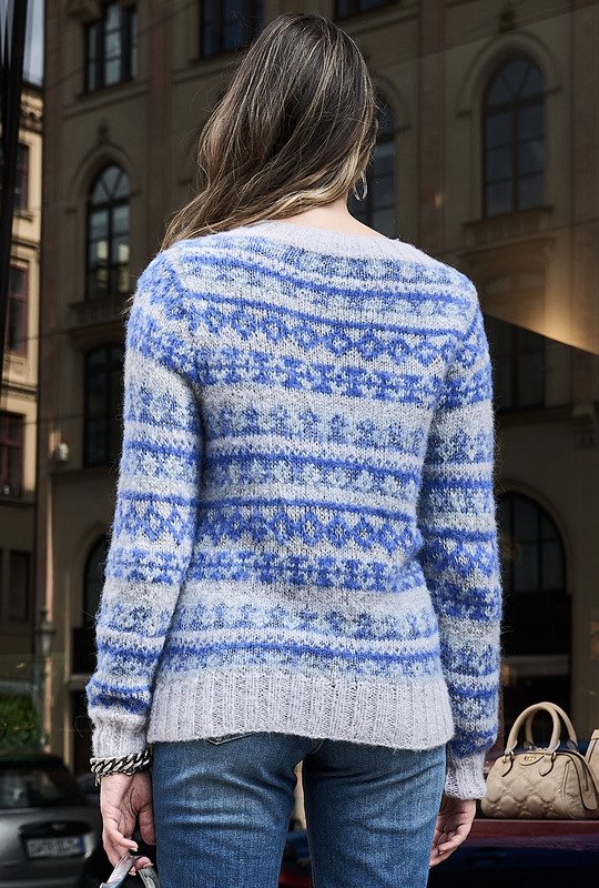 Material: Je 100 (125) 150 g Blau (Fb 0006) und Hellgrau (Fb 0103) "Alpaca Superlight" (54% Alpaka, 24% Polyamid, 22% Schurwolle, LL = 199 m/25 g), 100 (150) 150 g Grau (Fb 0003) "Enya" (63% Alpaka, 37% Polyamid, LL = 150 m/50 g) und 75 (100) 125 g Silber (Fb 0021) "Lamé" (71% Polyester (recycled), 29% Polyester, LL = 135 m/25 g) von LANGYARNS. Je 1 Rundstricknadel Nr 3,5 und 4,5.