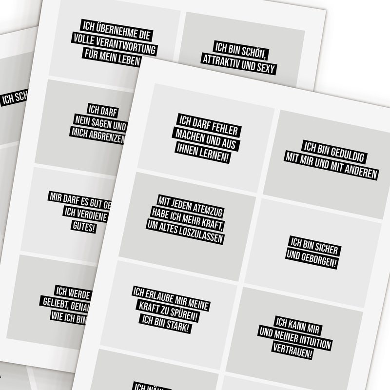 Du erhältst 3 DIN A4 Seiten mit insgesamt 24 Affirmationen. Diese schneidest Du nach dem Ausdrucken aus und kannst die 24 Zettel nach Herzenslust verpacken.