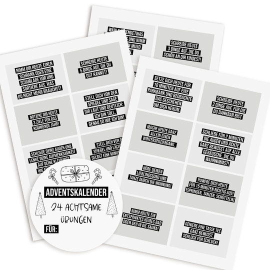 Du erhältst 3 DIN A4 Seiten mit insgesamt 24 Achtsamkeitsübungen. Diese schneidest Du nach dem Ausdrucken aus und kannst die 24 Zettel nach Herzenslust verpacken.