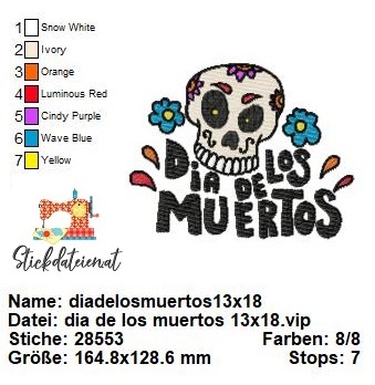 Diese Stickdatei mit einem bunten Totenkopf und dem Schriftzug "Dia de los Muertos" ist wie eine Feier des Lebens und der Erinnerung!
