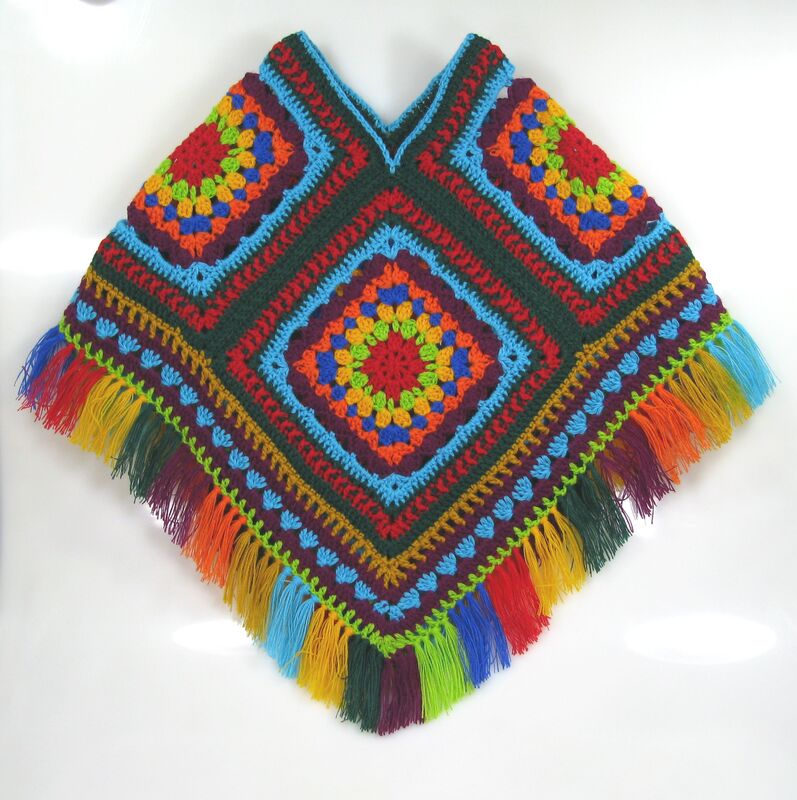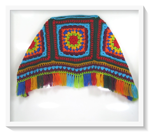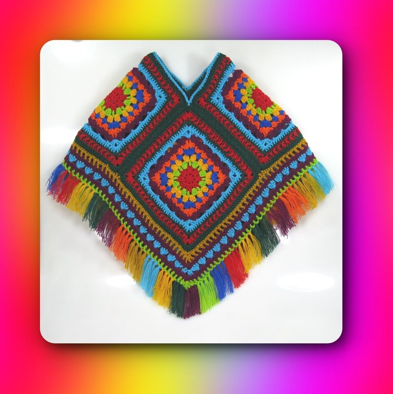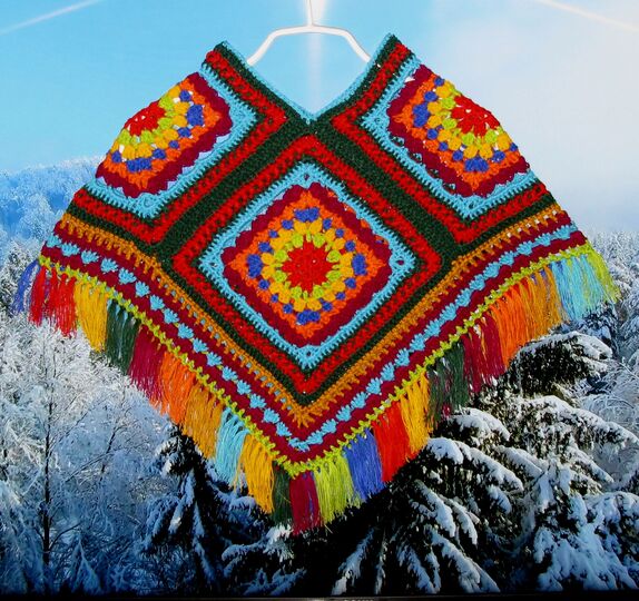 Der Poncho wird aus 4 Grannys gefertigt, zusammen genäht, mit einer breiten Borte umhäkelt und zum Schluß