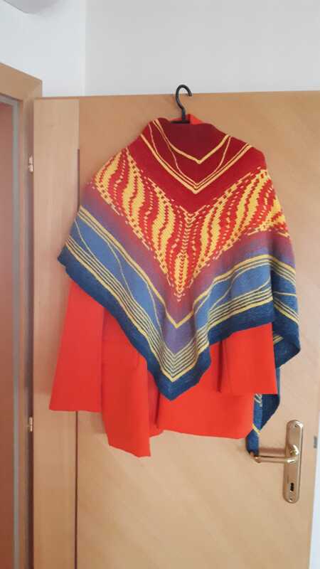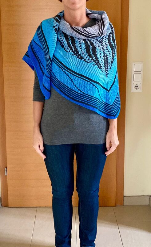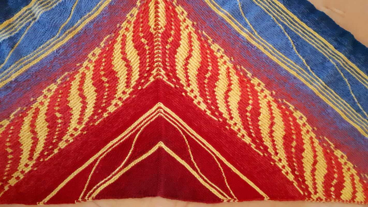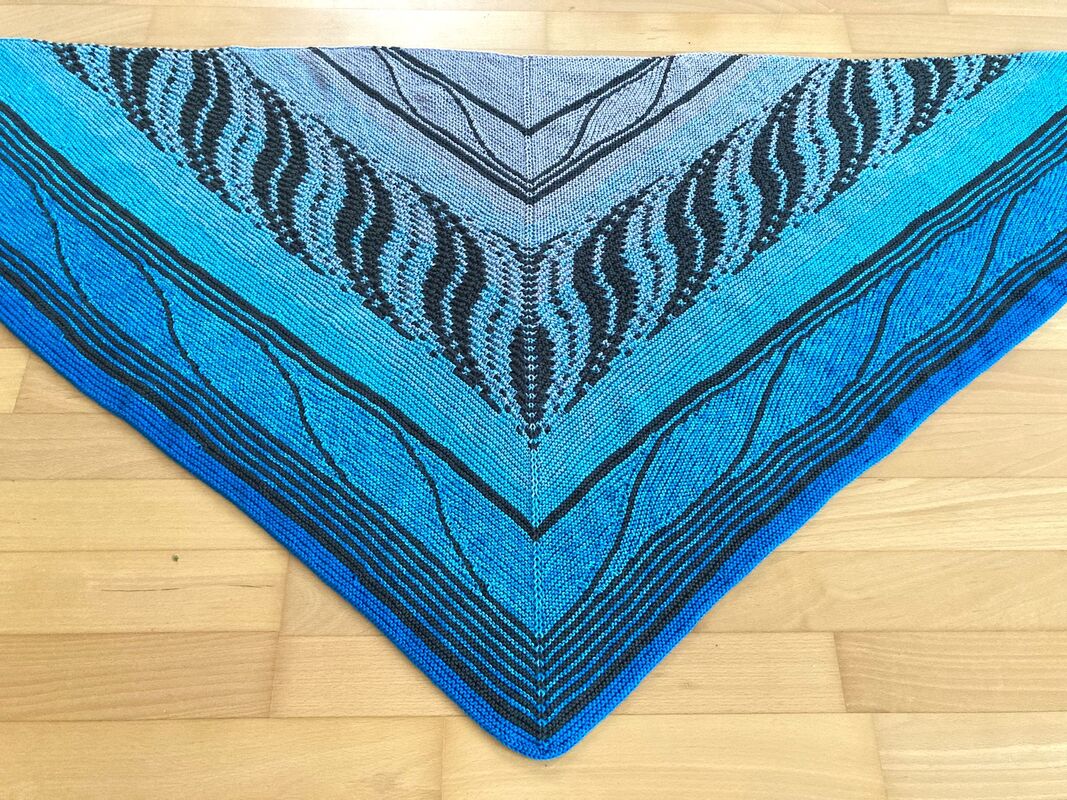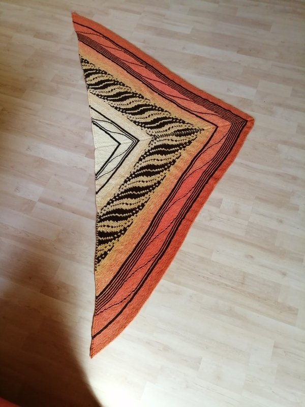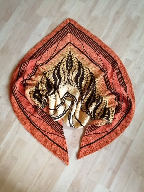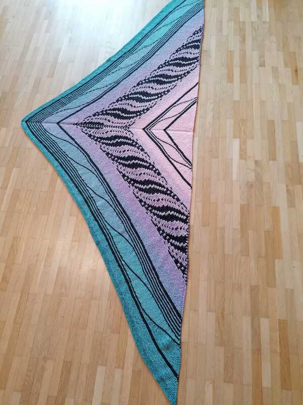 Es ist ein gleichschenkeliges Dreieckstuch, das mit verkürzten Reihen und Hebemaschenmuster gearbeitet wird.