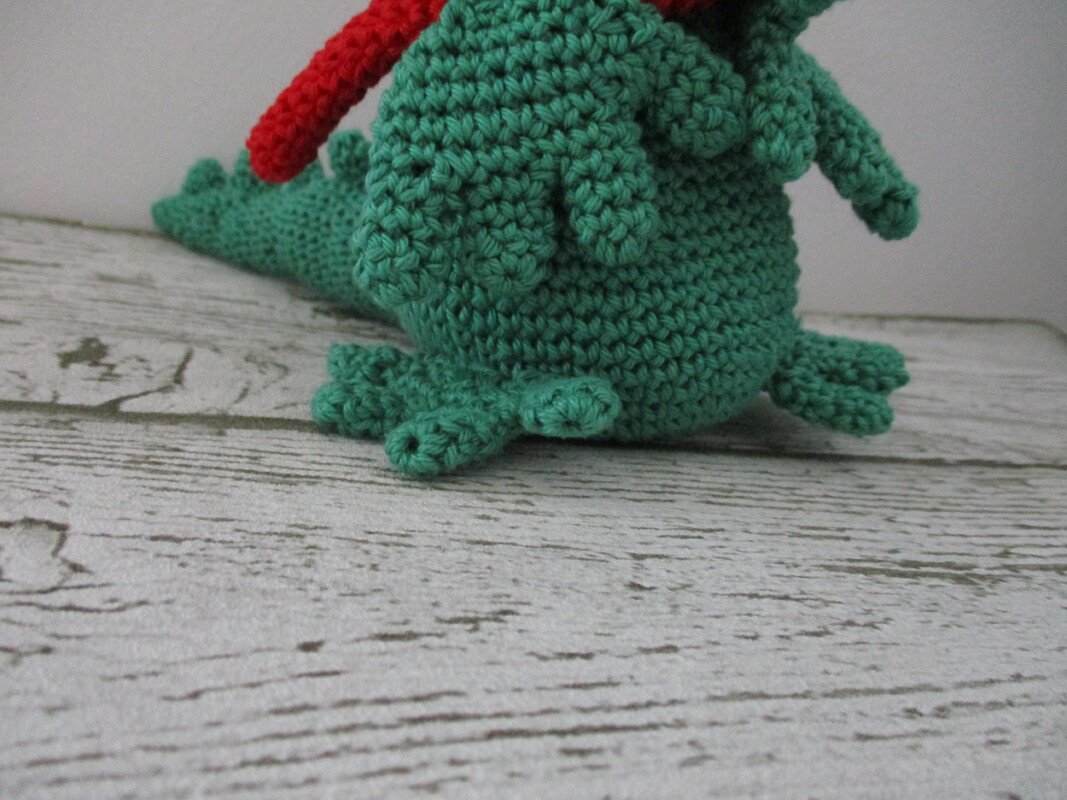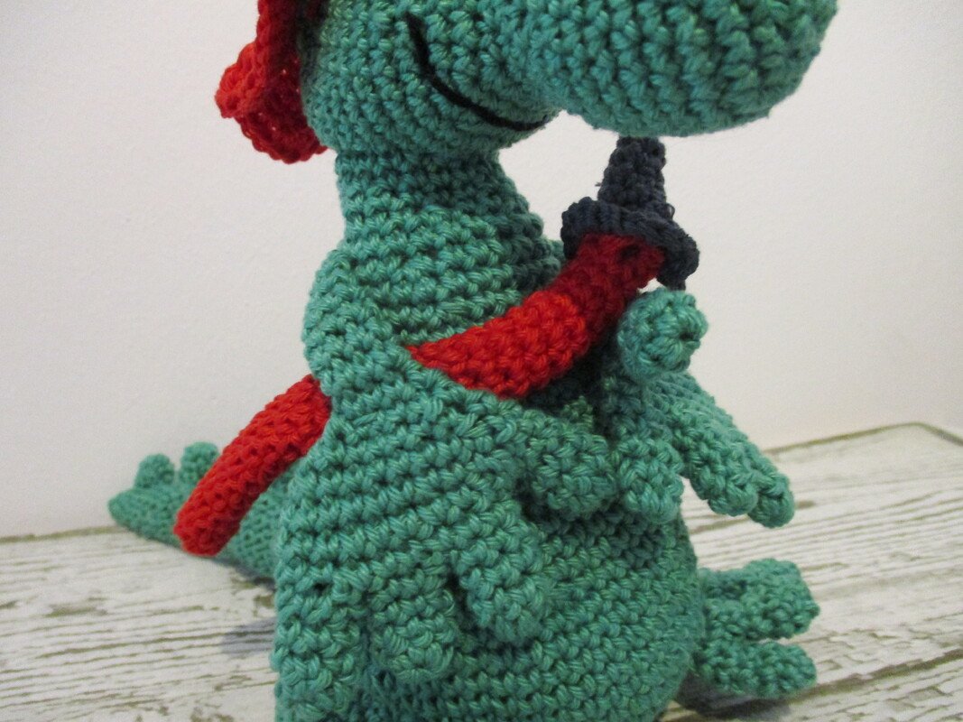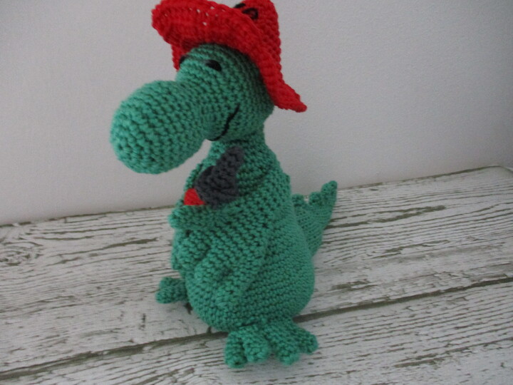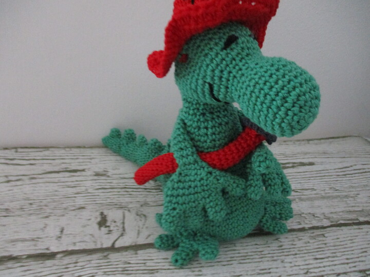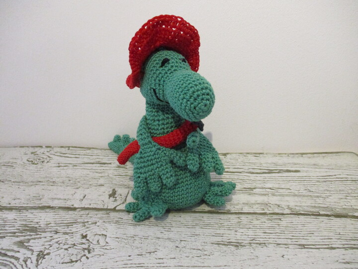 Bebilderte Anleitung die mit dir gemeinsam diesen süßen Drachen mit Feuerwehrhelm häkelt.