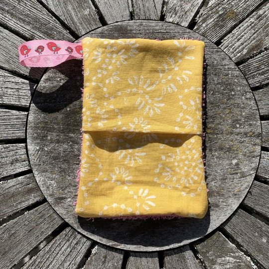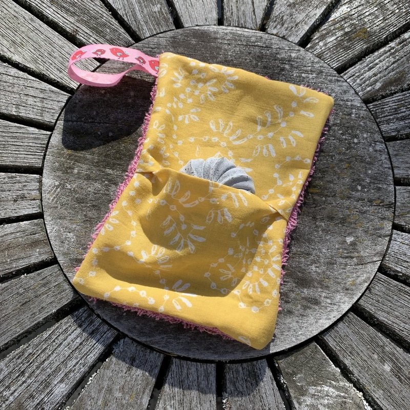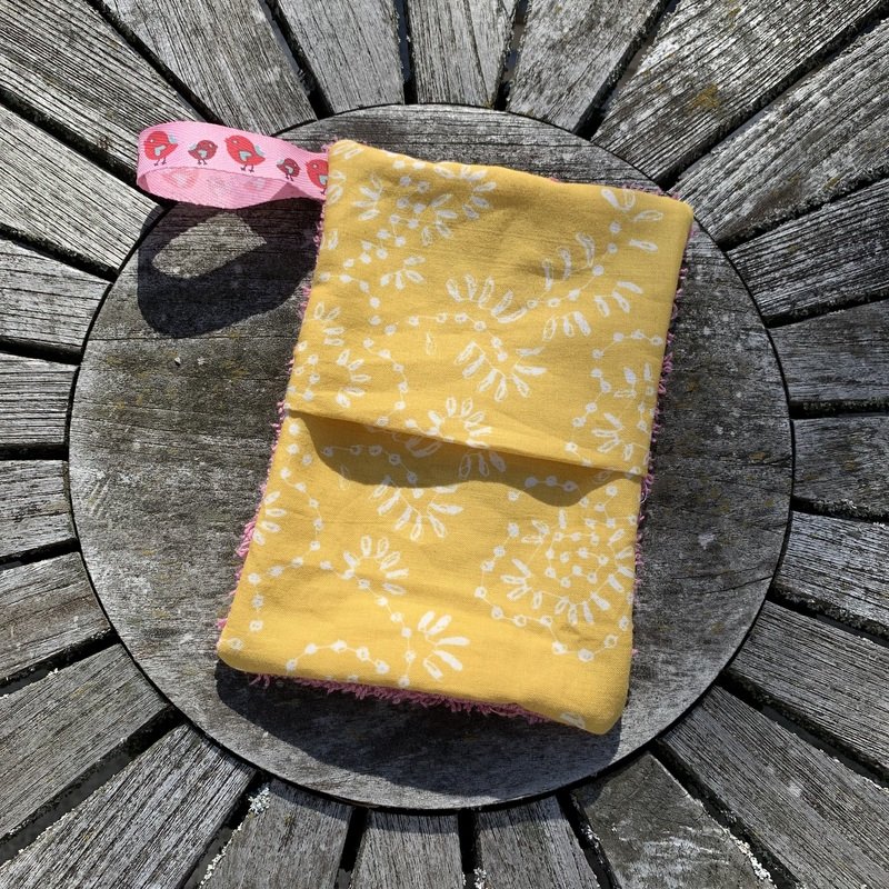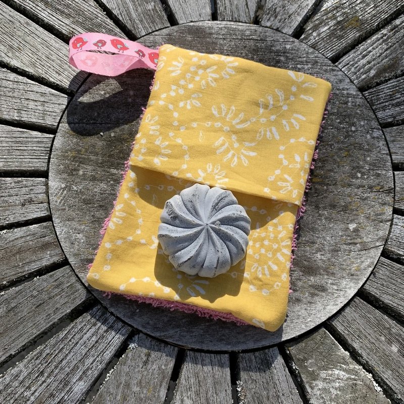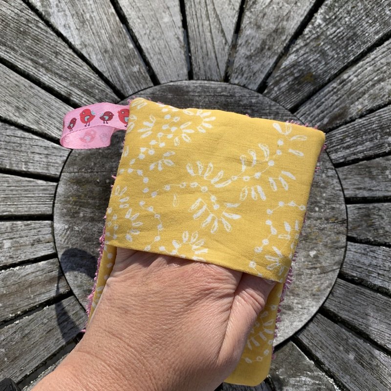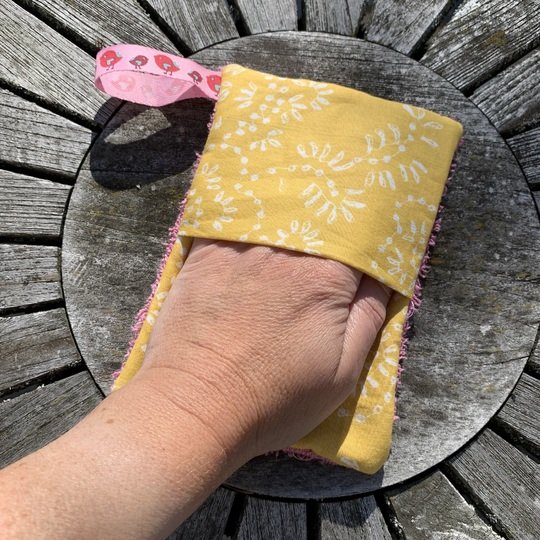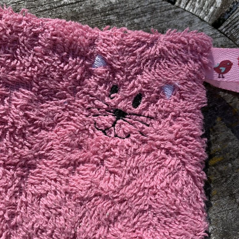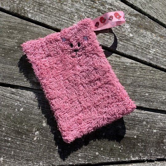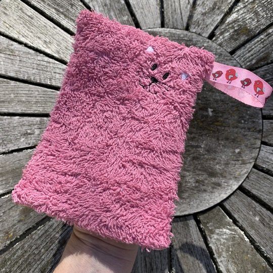 Der Waschlappen hat am Ende eine Breite von 11 cm und eine Länge von 16 cm.