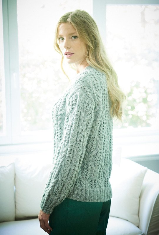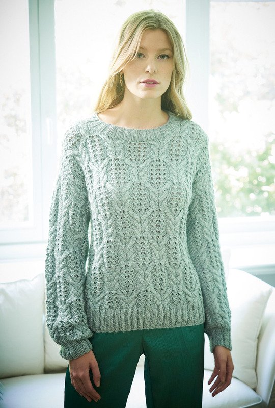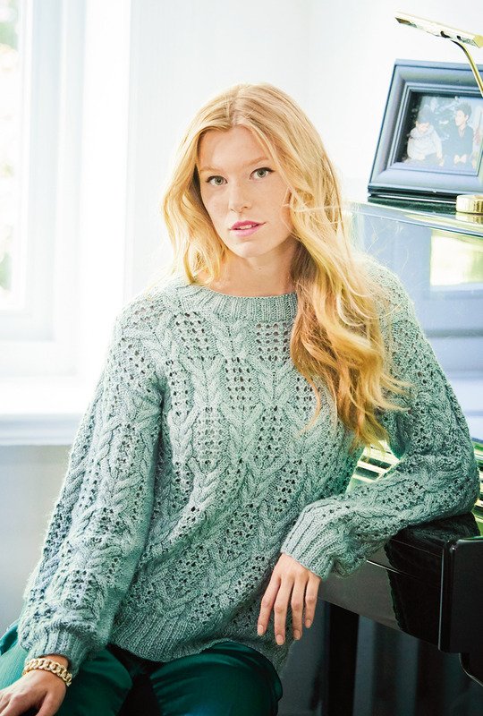 Nicht nur durch das exquisite Schurwoll-Seidengarn, sondern auch durch das aparte Muster, bei dem Zöpfe und Lochstreifen gemeinsame Sache machen, sticht dieser Pulli in Salbeigrün heraus. Ein Muster, das allen begeisterten StrickerInnen richtig Freude macht beim Stricken. Die Bündchen sind im 2/2-Rippenmuster gearbeitet. Nach dem Bund gewinnen die Ärmel an Weite und werden dann ganz gerade gestrickt und später eingenäht. Durch die etwas höhere Schulterschrägung ergeben sich leicht überschnittene Schultern. Die Anleitung gibt es für die Größen 36/38 und 42/44.