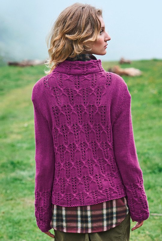 Wenn es Kaschmir sein soll, greifen die Frauen gerne zu leuchtenden Tönen. Wie hier zu einem intensiven Zyklam, das die nach innen versetzten Zopf-Lochstrukturen auf glatt-rechts-gestricktem Fond perfekt zur Geltung bringt. Keine Angst: Wir haben die Einteilung der Muster genau in unserer Anleitung beschrieben, sowohl verbal als auch in Form von Strickschriften. Da es für diesen Pulli keine Blenden gibt, musst du nur noch den Stehkragen anstricken und ihn zur Hälfte nach innen säumen.