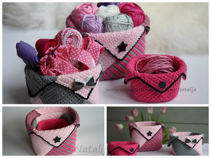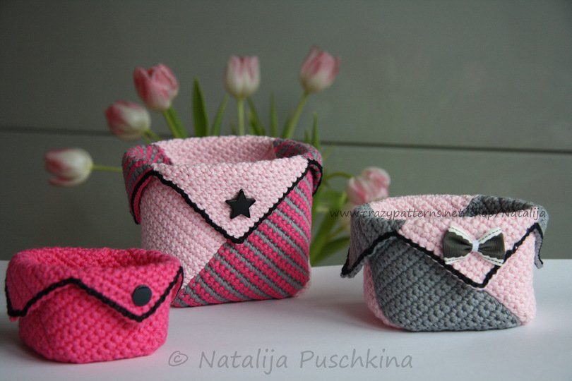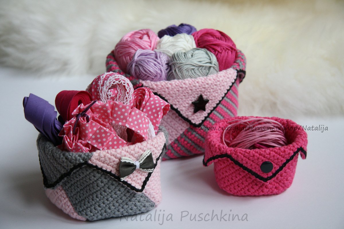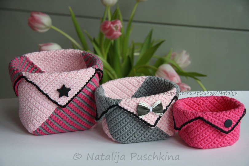 Mit diesem gehäkelten Körbchen-Set kann Du 100 Kleinigkeiten sortieren, verstecken und bei Bedarf schnell wieder finden. Die Körbchen eignen sich für Kramm in deinem Bad, Büro, auf dem Arbeitstisch, in der Küche und sogar im Auto. Ein Muss für Kinderzimmer – Puppenkleidung, kleine Bücher, Legos uvm. finden dort ein Plätzchen. Lass dieses Set für Ordnung in deinem Haus sorgen.