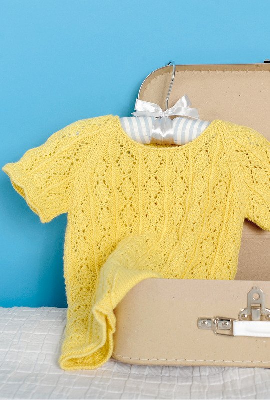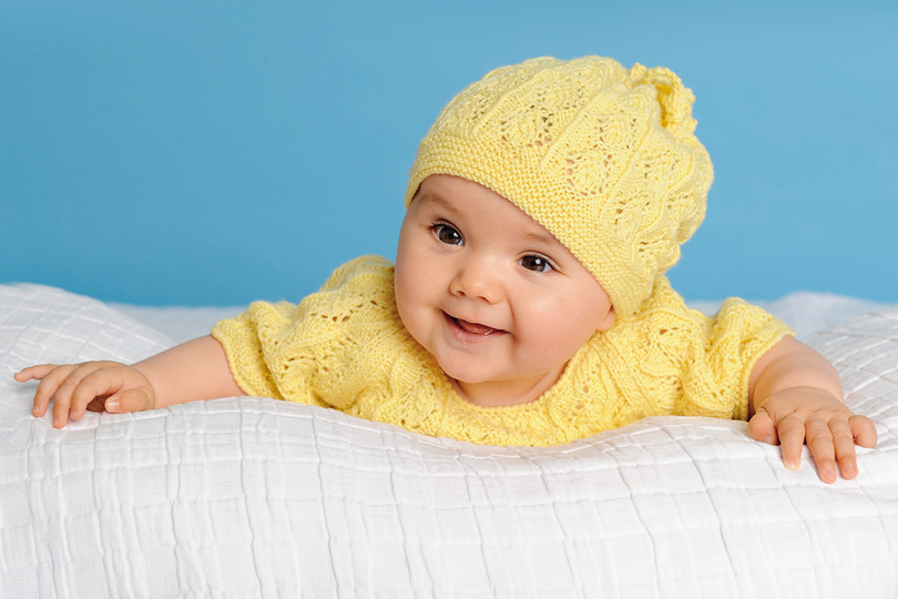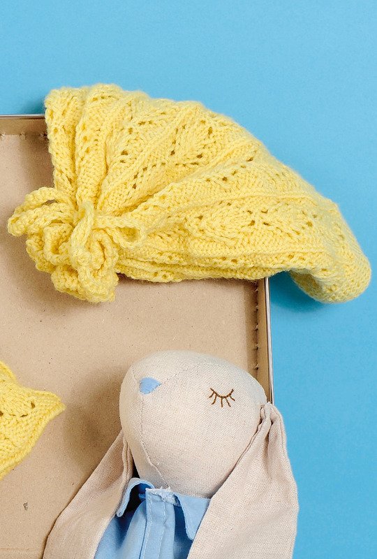 Dank des breiten, glatt rechts gestrickten Zwickels haben die Beinchen in diesem ansonsten im Lochmuster gestrickten Overall viel Platz. Der Schnitt mit kurzen Raglanärmeln bürgt für Bequemlichkeit beim Robben und Bewegen. Damit der Overall sich leicht anziehen lässt, ist er hinten geknöpft. Ganz entzückend dazu ist die Mütze, die einfach nur oben mit einer Kordel aus festen Maschen zugebunden wird. Alle Kanten werden mit festen Maschen und Krebsmaschen umhäkelt. Sie hat einen kraus rechts gestrickten Bund und bekommt dann dasselbe Lochmuster wie der Overall – so passt alles schön zusammen. Größe 68-74 a