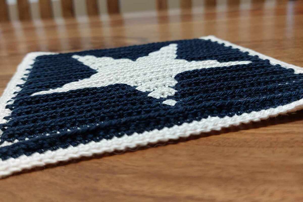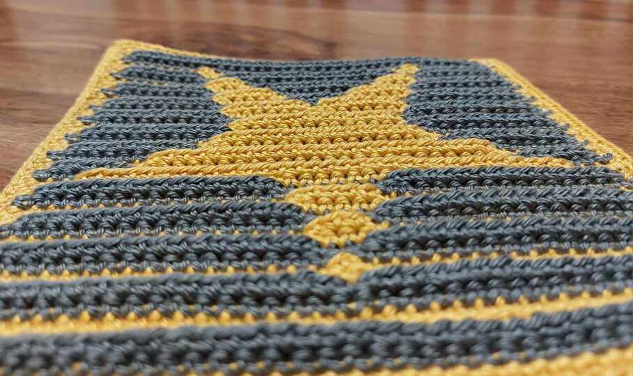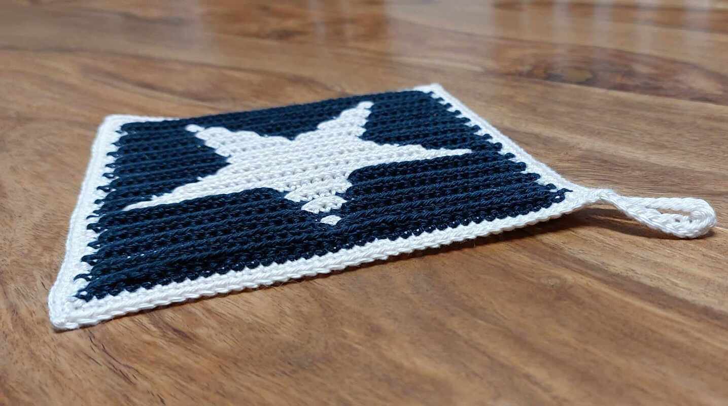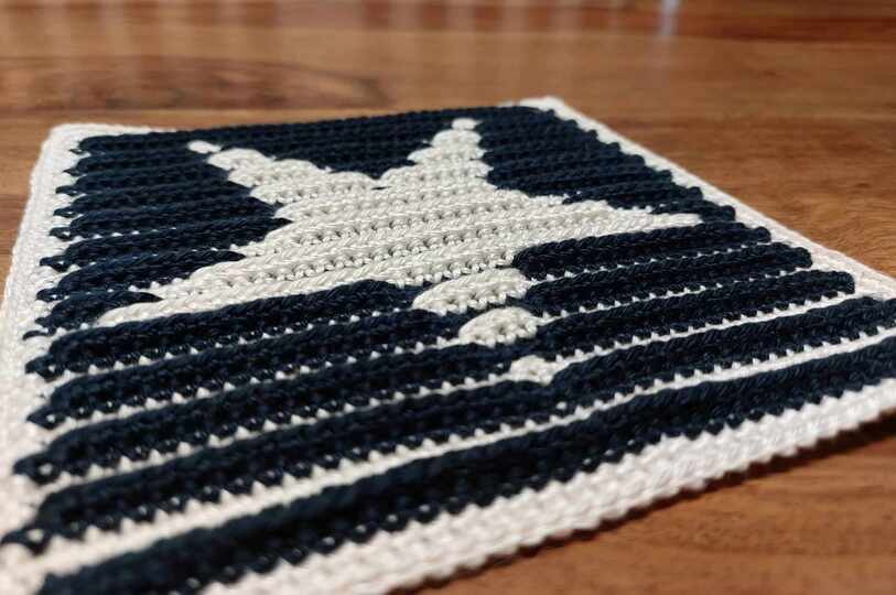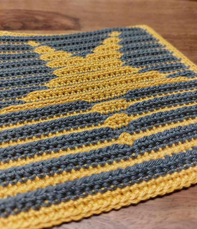 Er wird in Schattentechnik gehäkelt. Dadurch verändert sich sein Aussehen je nach Perspektive.