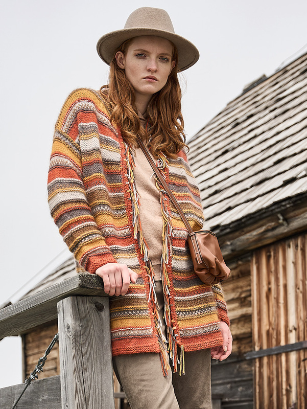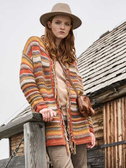 Ein Streifen glatt rechts, ein Streifen Jacquardmuster, ein Streifen kraus rechts, dazu der stete Wechsel aus glatter Merinowolle mit flauschigem Mohair in zehn verschiedene Natur- und Rostnuancen – so entsteht Stück für Stück eine tolle Jacke, die beim Stricken keine Langeweile aufkommen lässt. Zum Schluss werden die Verschlussränder der Vorderteile angehäkelt und mit Fransen in beliebiger Farbauswahl geschmückt – fertig ist Dein Lieblingsstück, das dich auf vielen Wegen begleiten wird.