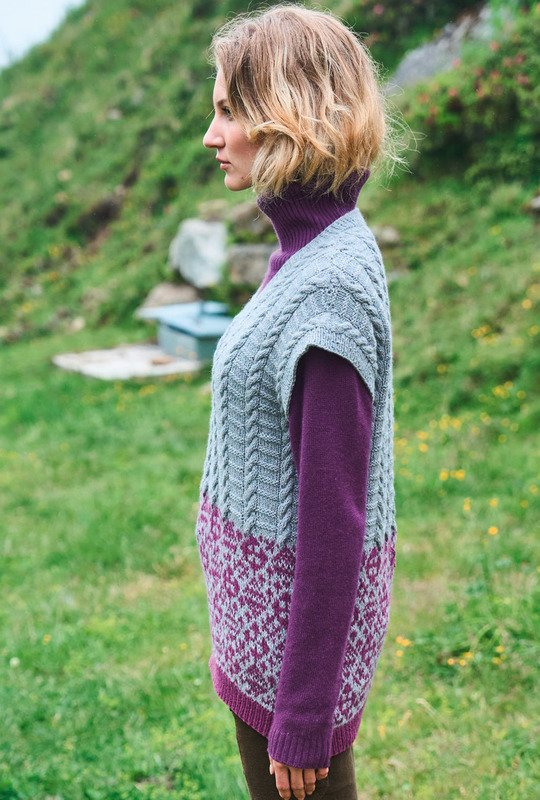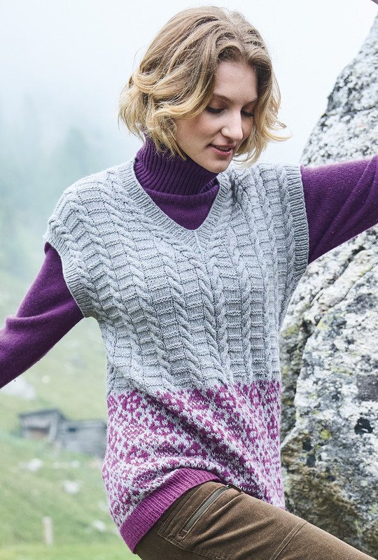 Wer hätte gedacht, dass der Pullunder im allgemeinen Modegeschehen immer wichtiger wird! Das ist kein Wunder, da er sich hervorragend kombinieren lässt und jedes Outfit bereichert. Dieser hier aus reinem Kaschmirgarn begeistert durch sein Spiel unterschiedlicher Muster: Unten eine zweifarbige Jacquardblende, oben markante Zopfstrukturen, die sich perfekt der V-förmigen Ausschnittschrägung anpassen. Und der Clou: Du strickst bis zu den Armausschnitten an einem Stück in Runden, danach wird die Arbeit erst geteilt.