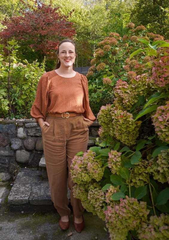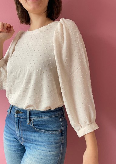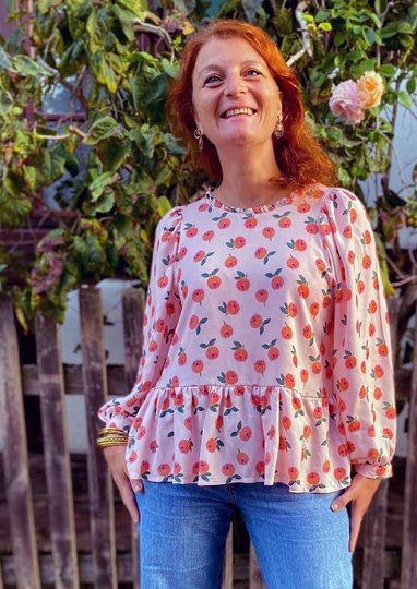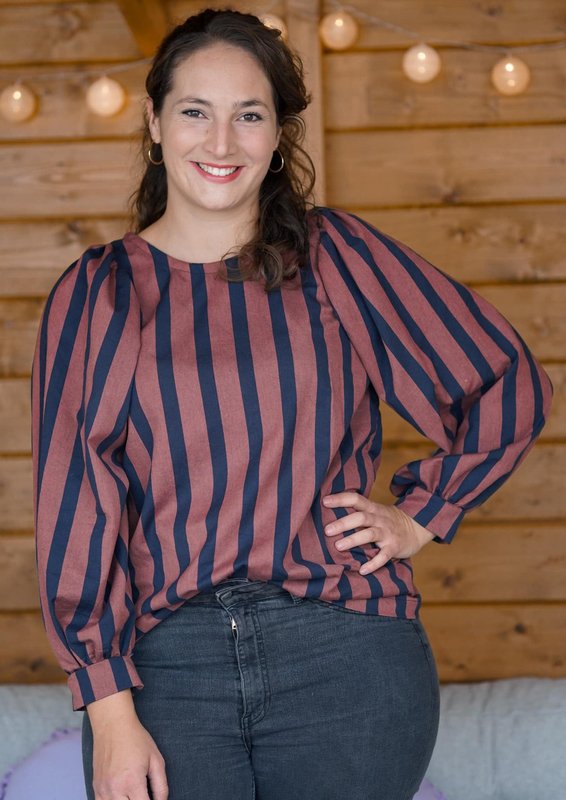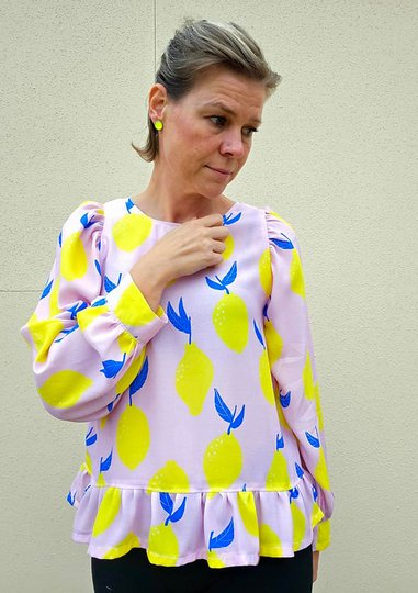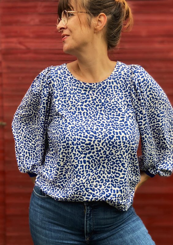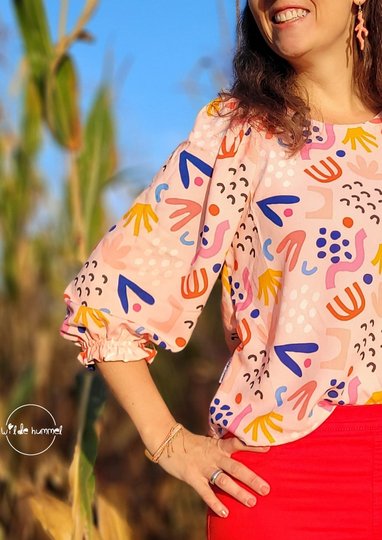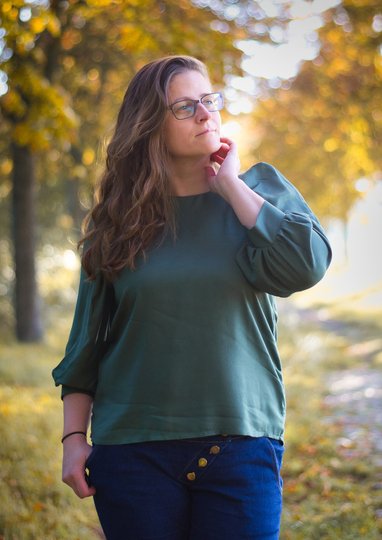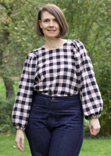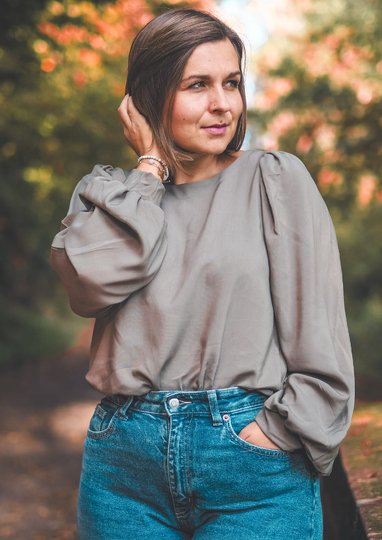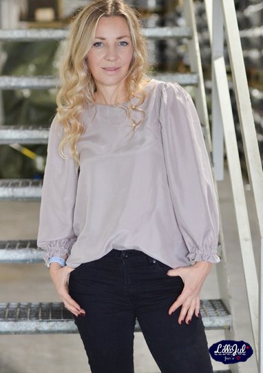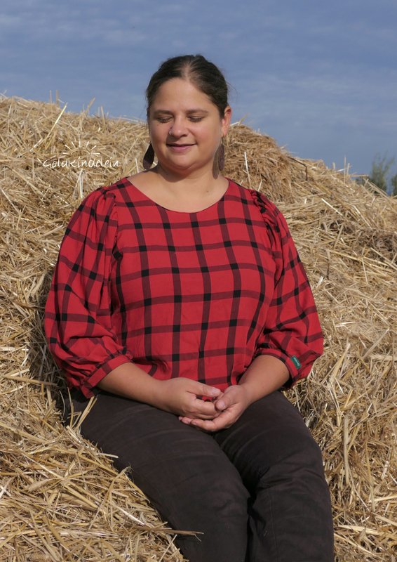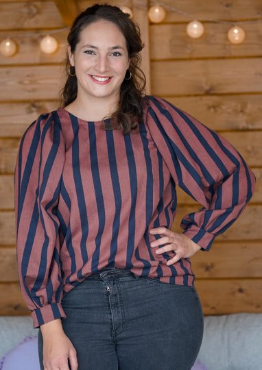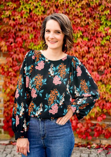 Regine ist ein Schnittmuster für eine stilvolle Bluse mit extra weiten gerafften Ärmeln. Sie verleihen dem Oberteil eine verspielte Note und dir einen femininen Look.