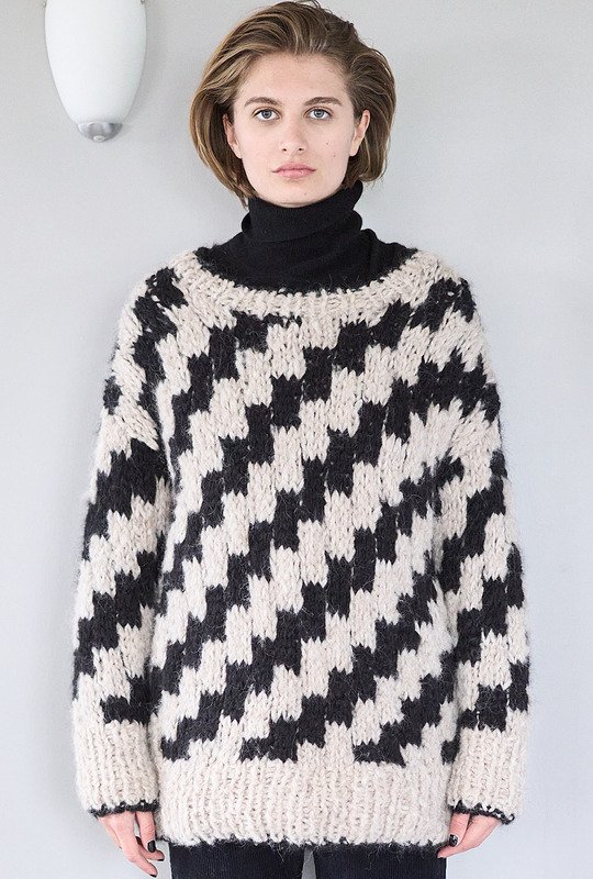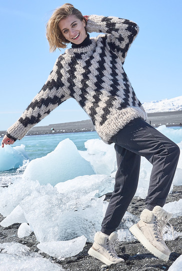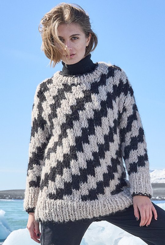 Voluminöse Fancygarne sind das Highlight in diesem Winter. Bei diesem Pulli sorgt die Felloptik für eine leicht plüschige Oberflächen-Struktur, die den treffenförmigen Musterverlauf noch attraktiver macht. Gestrickt wird mit Nadel Nummer 10 – so geht die Arbeit in Norwegertechnik schnell von der Hand. Der klassische Schnitt aus vier Teilen (Vorder- und Rückenteil plus die beiden Ärmel) wird mit schmalen Rippenblenden in Beige und einen Abschluss-Streifen in Schwarz vervollständigt,