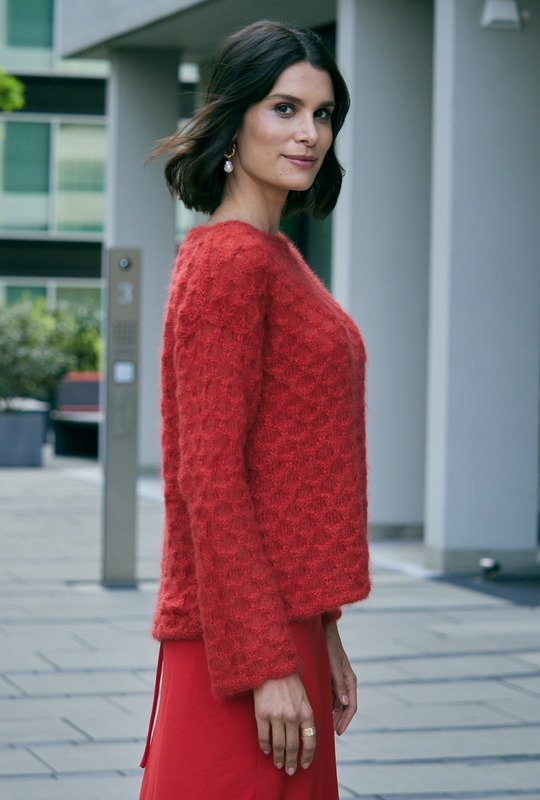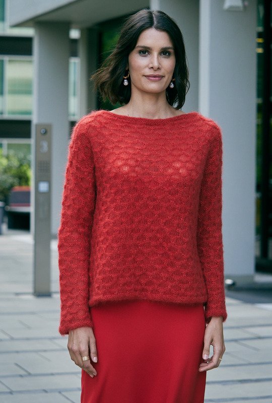 Auffällig ist bei diesem Pulli nicht nur die Farbe in Knallrot, es ist auch das edle Garn aus Mohair mit Seide, das dreifädig verstrickt wird. Der lässige, gerade Schnitt mit überfallenden Schultern und die von unten her geraden, offenen Ärmel, die nach oben hin an Weite gewinnen sowie der kleine runde Halsausschnitt geben diesem besonderen Pulli seine sportliche Lässigkeit. Die schmalen Blenden am Saum, den Ärmeln und dem Halsausschnitt werden glatt links gearbeitet, sodass sie sich leicht einrollen, ansonsten sticht das strukturgebende Wabenmuster ins Auge. Eine Anleitung dazu gibt es für die Größen 36/38, 40/42 und 44/46.