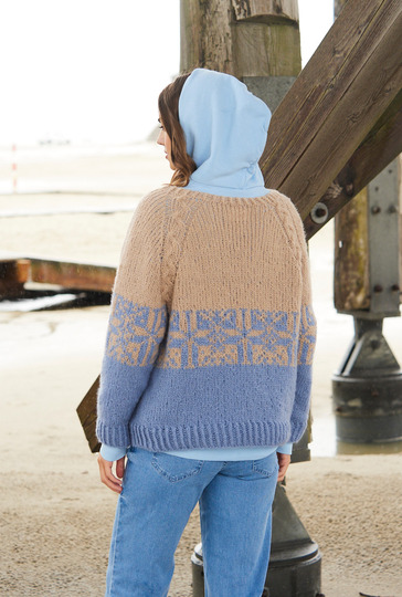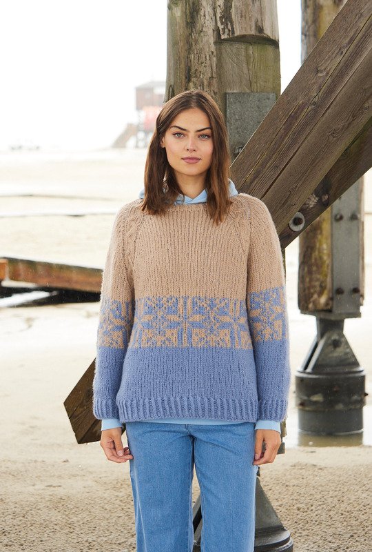 Der in einem Stück von oben nach unten gestrickte Pulli in dezenten Hellblau- und Sandtönen beeindruckt durch die mit einem Zopf betonten Raglanschrägungen sowie dem prägnanten Norwegermuster über der Brust und den Ärmeln. Für die Bündchen und die Halsausschnittblende wird 1 Masche rechts verschränkt, 1 Masche links im Wechsel gearbeitet. Das leicht flauschige Schurwollgarn mit etwas Polyester ist sehr angenehm auf der Haut. Eine Anleitung steht für die Damengrößen 38/40 und 50/52 und für die Herrengrößen 44/46 und 56/58 zur Verfügung.