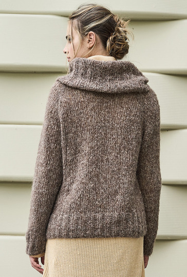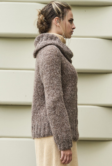 Material: 200 (225) 250 g Graubraun (Fb 17) "Piú Bella" (59% Alpaka, 20% Polyamid, 15% Kaschmir, 6% Schurwolle, LL = 100 m/25 g) von LANA GROSSA. Je 1 Paar Stricknadel Nr 5 und 6 sowie je 1 Rundstricknadel Nr 5 und 6.