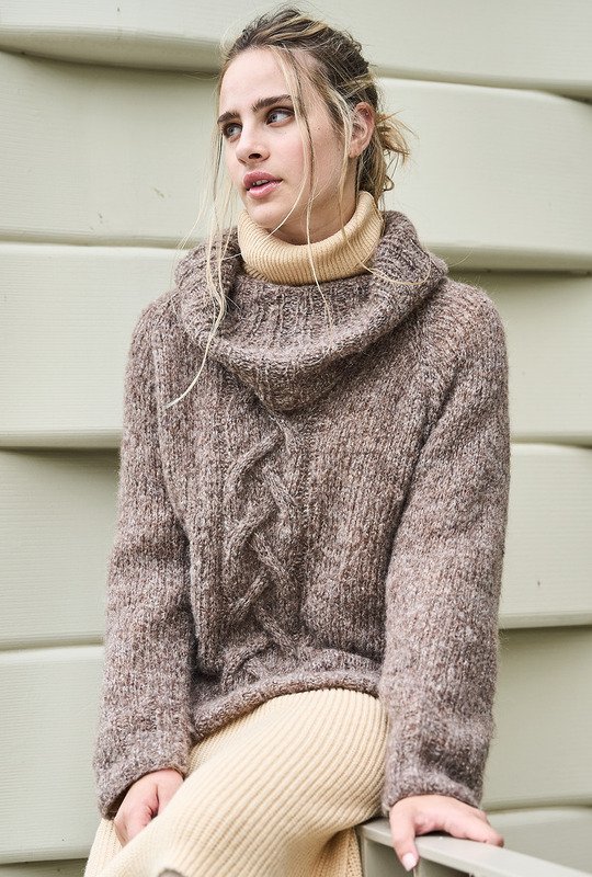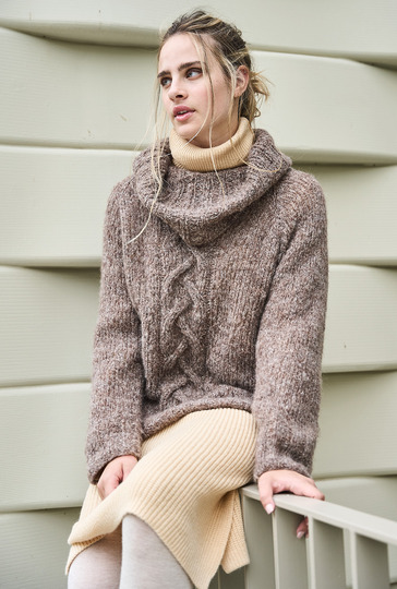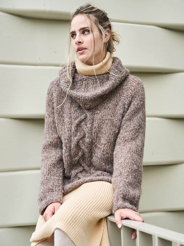 Farblich spielt sich jetzt in Sachen Strick viel in neutralen Basis-Tönen ab. Bei den Garnen sind es leichte Bouclé-Effekte, die durch ihre unregelmäßige Haptik der Masche Spannung und Dynamik verleihen. Beides zusammen macht den graubraunen Pullover zum zeitlos-schicken Begleiter, der durch den lässigen Raglanschnitt und den voluminösen Rollkragen die modische Note erhält. Hauptsächlich glatt rechts gestrickt sorgt der breite Mittelzopf für optische Reize.