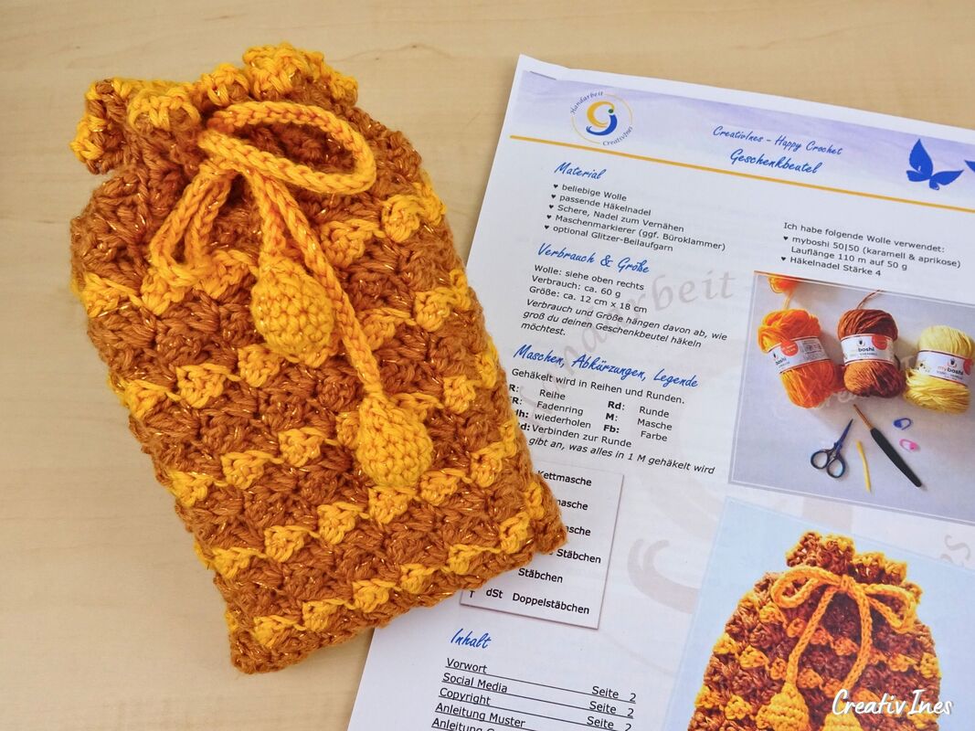 Mit dieser PDF-Anleitung häkelst du Geschenkbeutel in deiner Wunschgröße, und das dekorative Muster ist nicht nur schön anzusehen, sondern auch blickdicht, sodass du kein zusätzliches Verpackungsmaterial benötigst. Eine umweltfreundliche Alternative zu Papier und Folie.