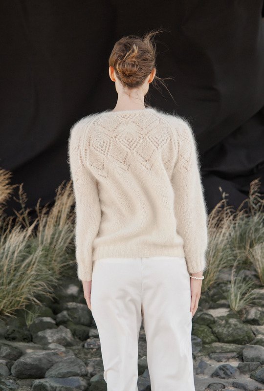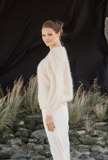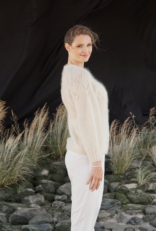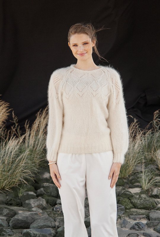 Der dreifädig gestrickte Pullover mit Raglanärmeln ist überaus anschmiegsam und wertet jedes Outfit elegant auf. Man fühlt sich durch das naturweiße Garn aus kuscheligem Kidmohair mit glatter Seide in diesem Pulli so wohl, dass man ihn am liebsten immer tragen würde. Bis zum Armausschnitt wird für die Bündchen im Rippenmuster und danach glatt rechts gestrickt, danach folgt die Passe im abwechslungsreichen Ajourmuster. Um den runden Halsausschnitt wird abschließend ein I-Cord gestrickt; wie das geht, steht ebenfalls in der Anleitung für die Größen 38/40 und 46/48.