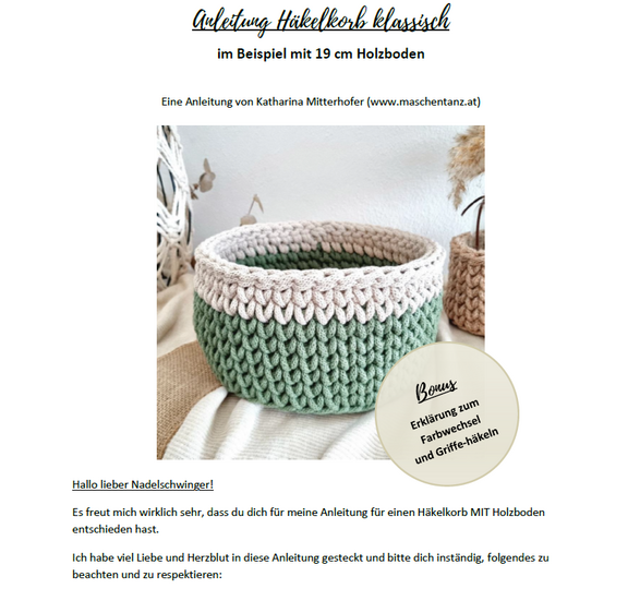 Die nach der Anleitung entstandenen Körbe dürfen gern verkauft und verschenkt werden, Fotos dürfen immer gern im Internet gezeigt werden. Bitte mich dabei als Designerin angeben (@maschentanz.at)