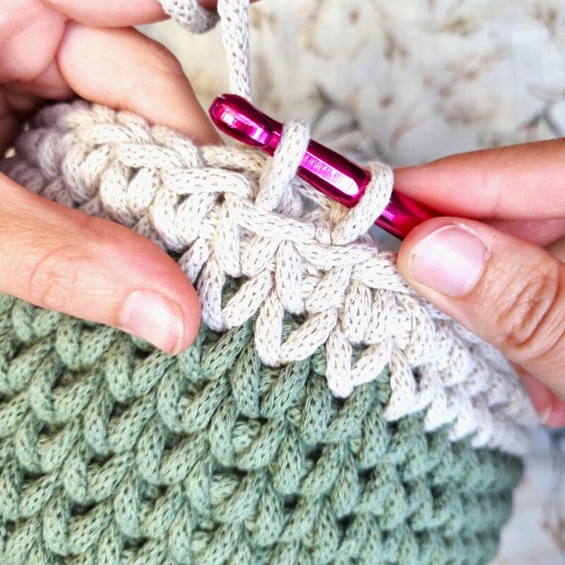 Die Basisanleitung ist mit einem Hozboden mit 19 cm Durchmesser gearbeitet. Mit insgesamt 50 Bildern zeige ich dir, wie du selbst einen tollen Häkelkorb zaubern kannst. In der Anleitung findest du die Beschreibung für den Farbwechsel und eine bebilderte Erklärung, wie Griffe für den Korb gehäkelt werden.