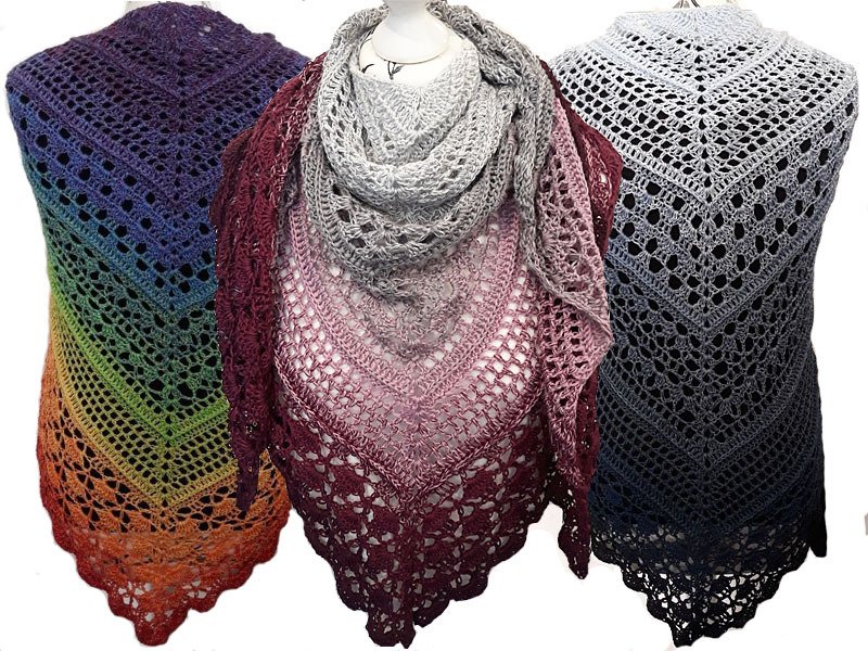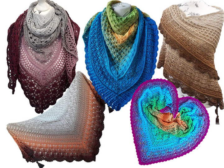 In diesem Paket habe ich für euch 5 meiner beliebtesten Anleitungen für klassische Häkeltücher, die von oben in der Mitte gehäkelt werden.