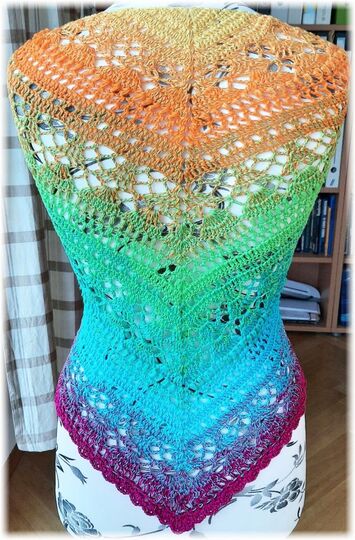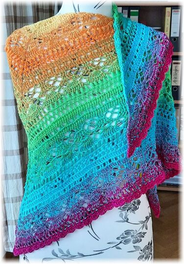 Gloria ist ein lockeres Tuch mit verschiedenen Mustern. Eine schöne große Borte als Abschluss und eventell Quasten machen es zu einem besonderen Hingucker. Ihr braucht ein Bobbel mit mindestens 800m, 3 oder 4 fädig und Häkelnadel 3 bis 4, je nachdem wie fest oder locker ihr häkelt. Gloria ist ca 180cm x 80cm groß.