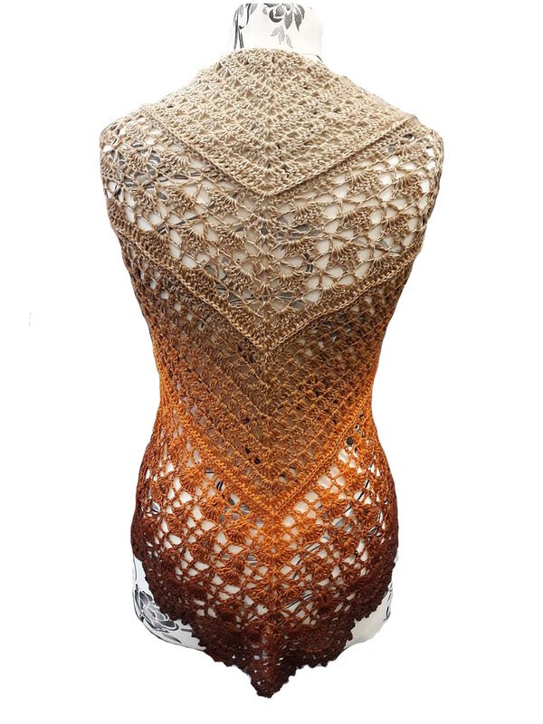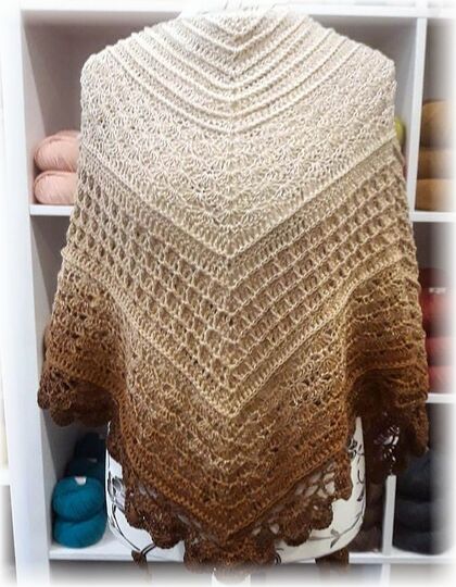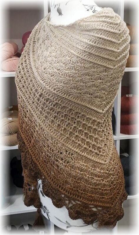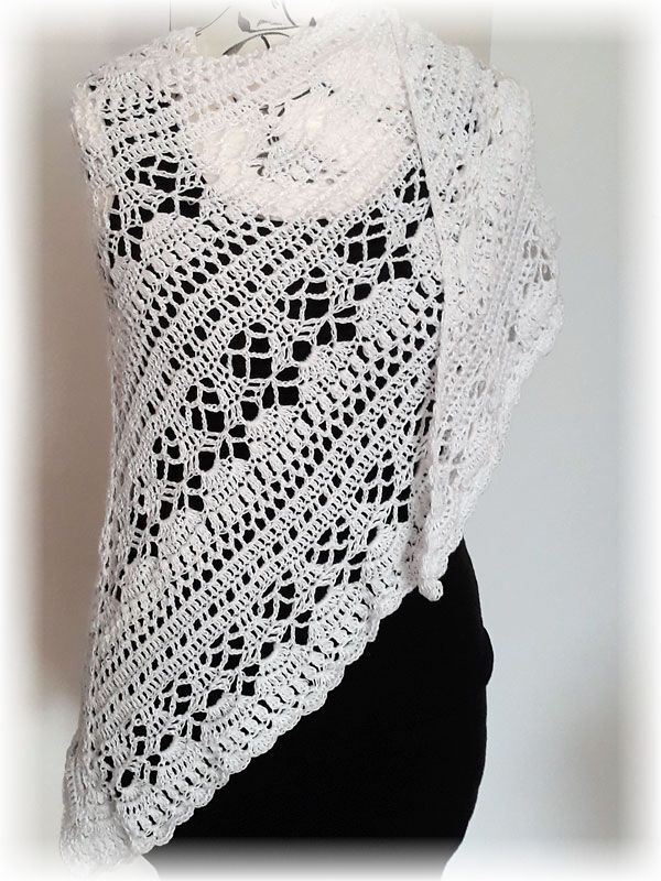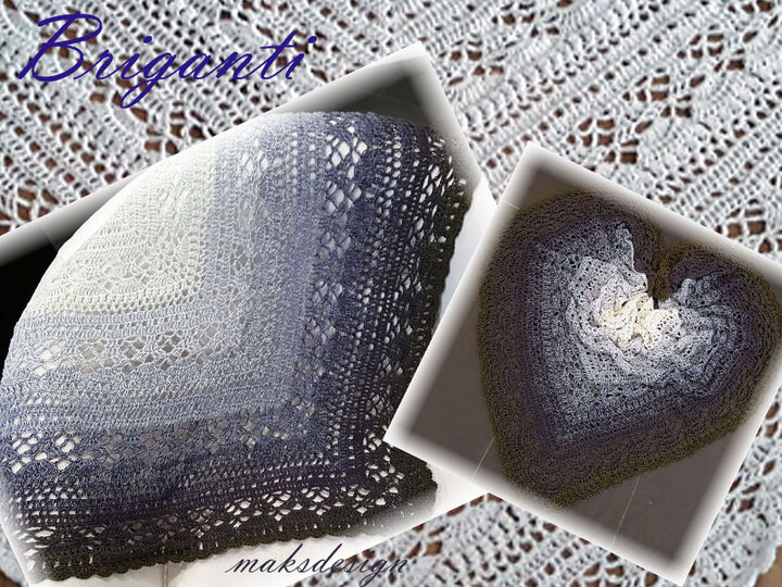 Briganti hat ein luftiges Muster, das sich immer wiederholt. Es ist in weiß oder creme perfekt als Brauttuch geeignet, da das Muster fein ist. Ihr braucht ein Bobbel mit mindestens 800m, 3 oder 4 fädig und Häkelnadel 3 bis 4, je nachdem wie fest oder locker ihr häkelt. Briganti ist ca 180cm x 80cm groß.