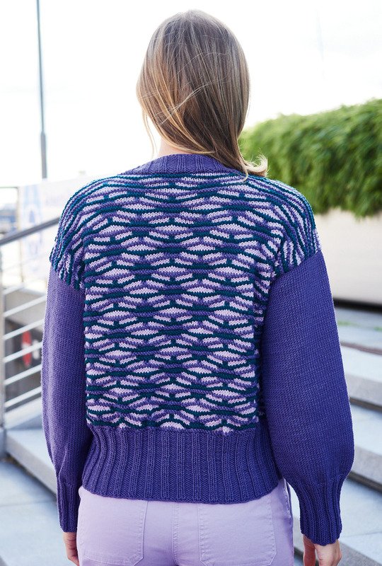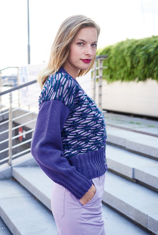 Dies taillenkurze Jacke mit weiten Ärmeln und hohem Bund – auch an den Ärmeln – lebt vom Kontrast der drei Farben Lila, Flieder und Tannengrün. Für das Hebemaschenmuster werden stets 2 Reihen in einer Farbe gestrickt und laut Strickschrift bestimmte Maschen angehoben, dazwischen gibt es regelmäßig 2 Reihen nur aus kraus rechten Maschen in Lila oder Tannengrün. Die Ärmel sind glatt rechts ganz in Lila gearbeitet. Große Knöpfe an der Rippenblende, die um den V-Ausschnitt weiterläuft, sind ein weiteres auffälliges Detail. Die Anleitung für das Modell aus einem Schurwolle-Polyacryl-Mischgarn ist für die Größen 38/40 und 46/48.