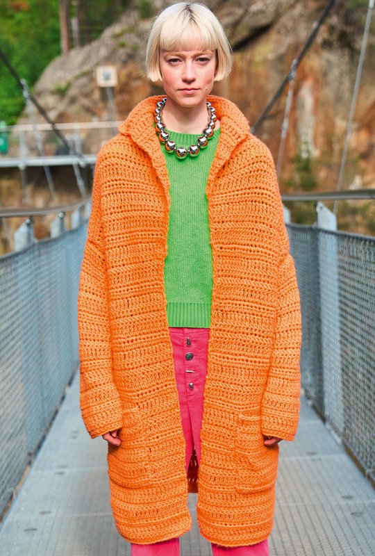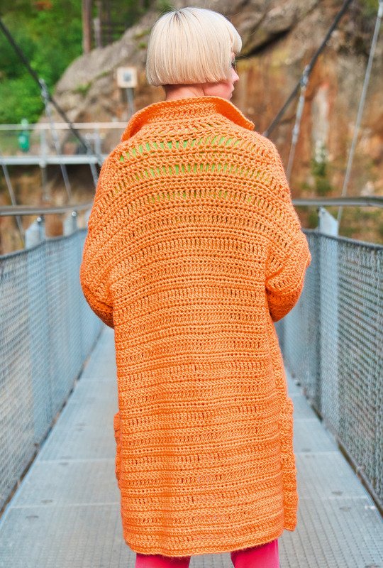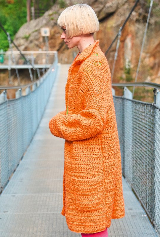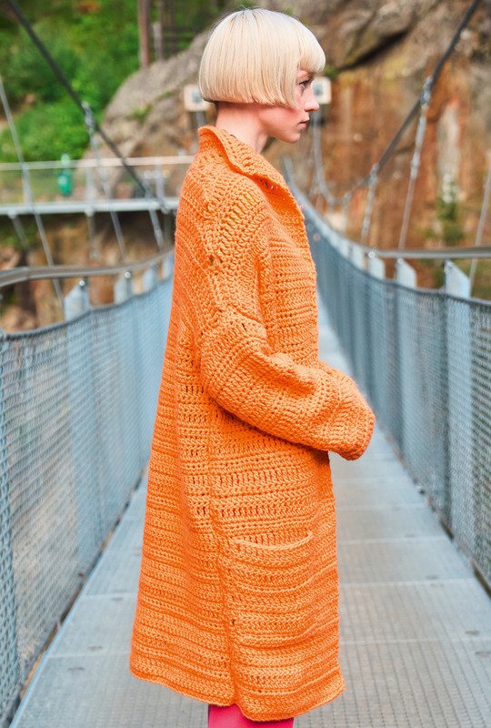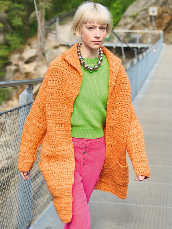 Lange haben sich Frauen nicht an robuste Mäntel getraut und sie oft nur im Outdoorbereich getragen. Mit sinkenden Raumtemperaturen dreht sich das Blatt. Schnell übergeworfen wird er jetzt nicht nur zum wärmenden, sondern auch zum modischen Statement. Schönstes Beispiel: Der Häkelmantel in kräftigem Orange. Er entsteht aus halben und doppelten Stäbchen – also ganz easy und schnell. Dann nur noch die Taschen und den Kragen nadeln, fertig ist ein Stück, an das sich auch weniger versierte Häkelfans wagen können.