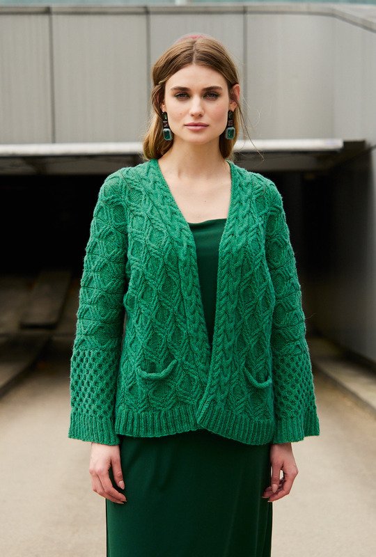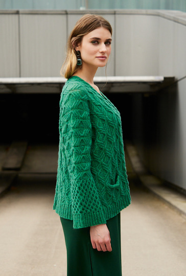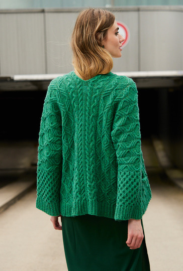Die verschlusslose Jacke wird mit angeschnittenen Ärmeln in einem Stück über die Schultern hinweg gearbeitet, die Ärmel abschließend von oben nach unten an die angeschnittenen Ärmel gestrickt. Verschiedenen Zopfmuster sorgen für Abwechslung beim Stricken, sodass Geübte hier viel Freude haben werden. Begonnen wird mit 2/2-Rippen am Bund, danach geht es weiter mit einem außergewöhnlichen Zopfmuster und an den vorderen Kanten mit zweierlei Zopfmuster und Patentrand – ein wirklich ausgesprochen besonderes Modell. Die Ärmel haben ein Wabenzopfmuster. Für die Jacke aus grünem Baumwolle-Schurwolle-Alpaka-Mischgarn gibt es eine Anleitung für drei Größen: 36–40, 42/44 und 46–50.