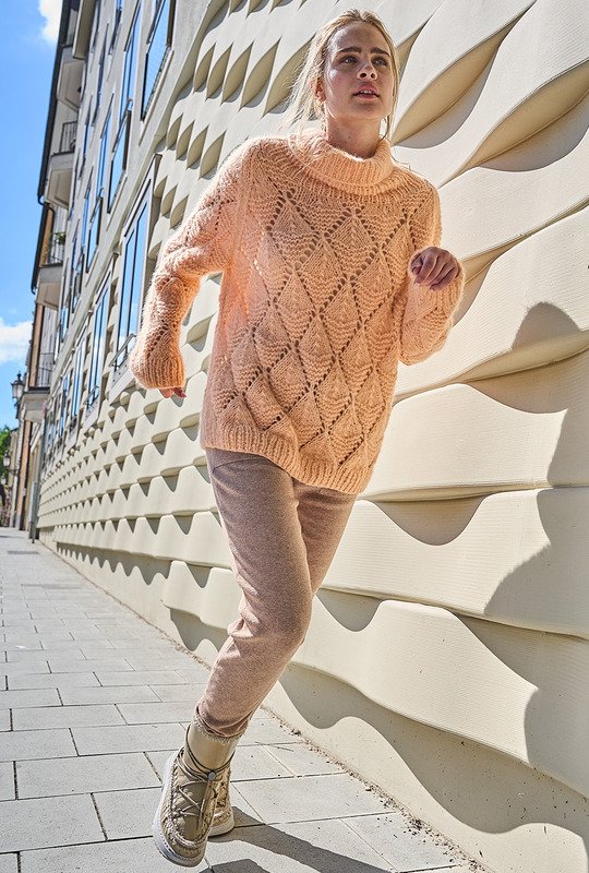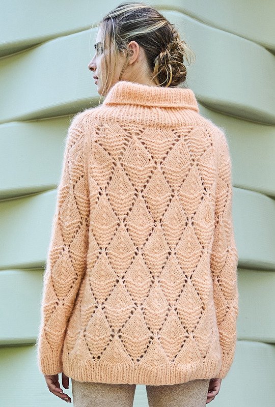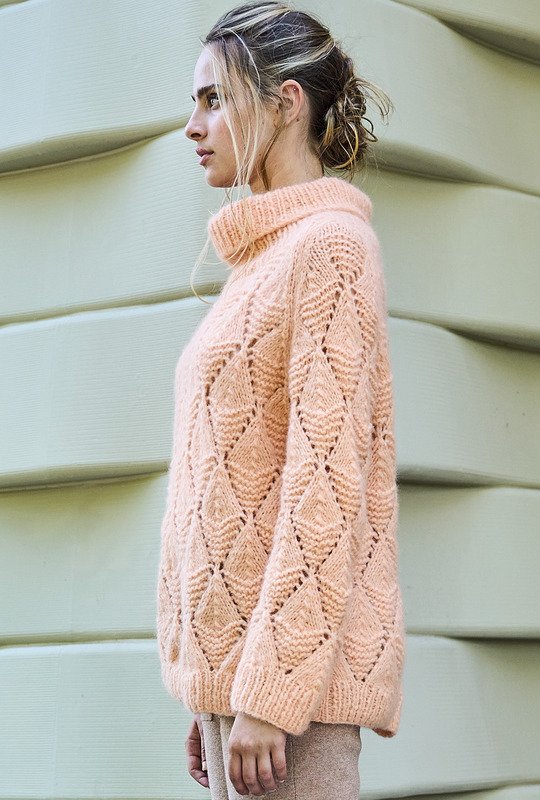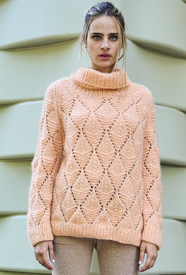 Das lachsfarbene Alpakamischgarn dieses lässigen Raglanpullis ist ausgesprochen flauschig und unterstützt den Trend zur Gemütlichkeit. Außerdem lässt es alle Muster toll zur Geltung kommen. Hier sind es großzügige Rautenstrukturen, die sich allover präsentieren und mit Kraus-rechts-Partien fast dreidimensional wirken. Eine übersichtliche Strickschrift hilft Dir beim Einteilen der Umschläge und zusammengestrickten Maschen. Schmale Rippenblenden und ein voluminöser Rollkragen vervollständigen das winterliche Maschenbild.