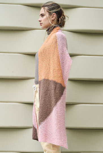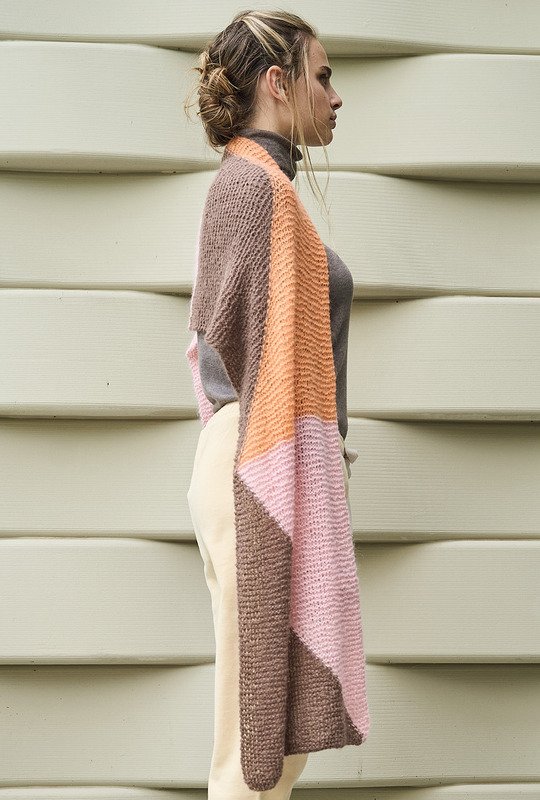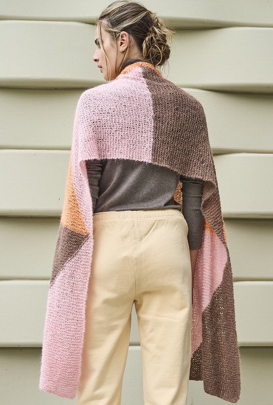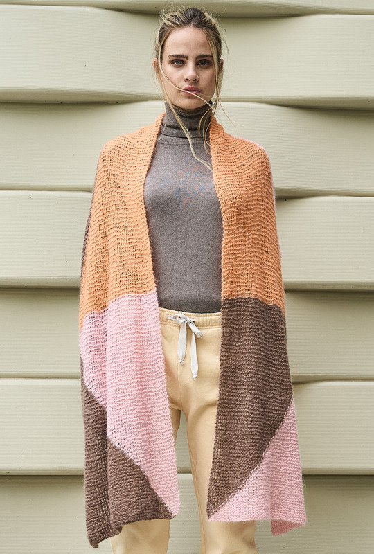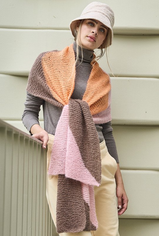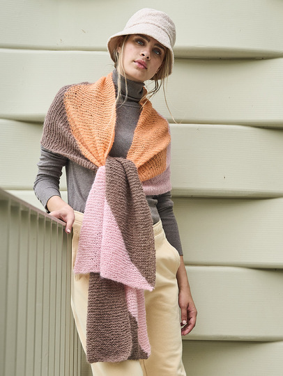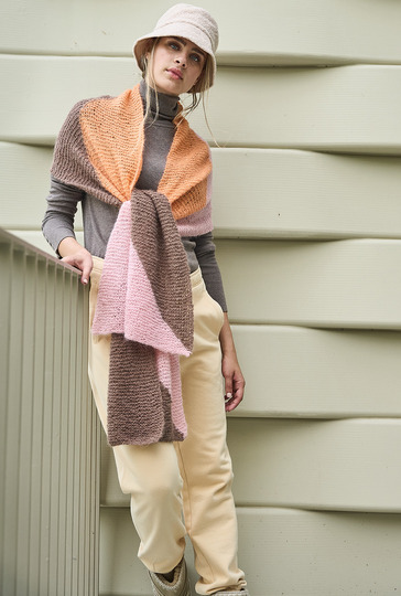 Tücher und Schals sind jetzt unverzichtbare Accessoires. Sie wärmen nicht nur, sondern vervollständigen mit diversen Farbspielen – hier in Nougat, Lachs und Rosa – jedes winterliche Outfit und kommen auch noch im Frühjahr zum Einsatz. Bei diesem breiten Schal aus federleichtem, doppelt verstricktem Alpaka-Seidengarn entstehen die grafischen Flächen in Intarsientechnik. Das heißt, Du verwendest für jede Farbfläche ein separates Knäuel und verkreuzstbeim Farbwechsel die Fäden auf der Arbeitsrückseite um Löcher zu vermeiden. Tipp: Stricke ein kleines Stück an und probiere es aus, es geht ganz einfach!