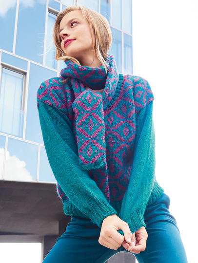 Für den V-Ausschnittpulli aus leichtem Polyacryl-Schurwolle-Mischgarn wird das Vorder- und Rückenteil in einem plakativen Jacquardmuster gestrickt. Die Ärmel sind ganz in Grün gearbeitet. Die Bündchen bestehen bei allen Teilen aus 2/2-Rippen in Grün, auch die Ausschnittblende, die zunächst noch einen schmalen Streifen in Erika bekommt. Überschnittene Schultern lassen den Pulli wie einen Pullunder wirken. Der passende Schal im selben Muster ist extra schmal und lang geschnitten. Die Anleitung ist für die Größen 36/38, 40/42 und 46/48; der Schal hat das Maß 10 x 194 cm.