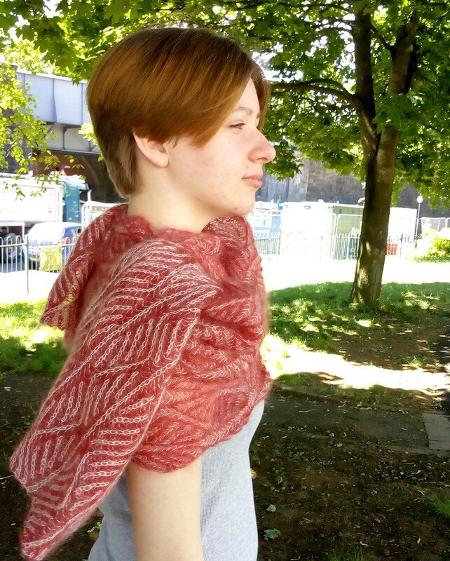 Das Tuch wird in einem Stück gestrickt, beginnend mit einem italienischen Anschlag für Patent in zwei Farben.