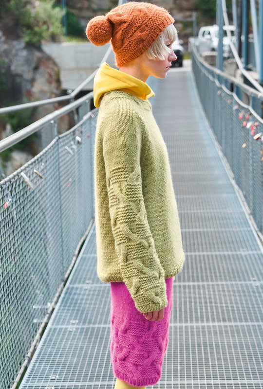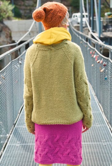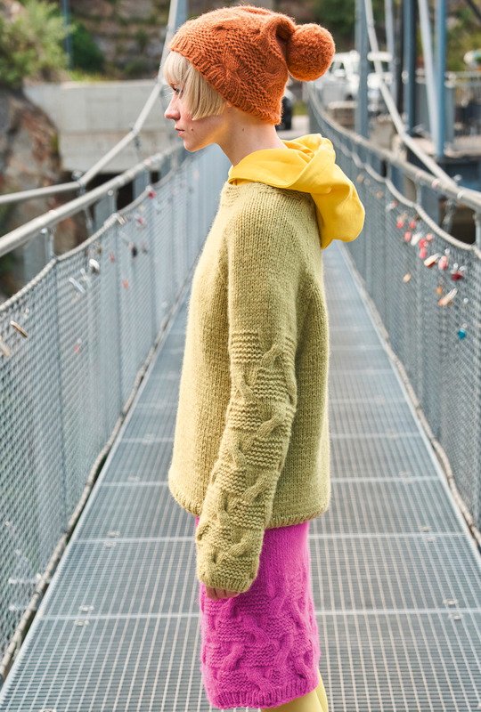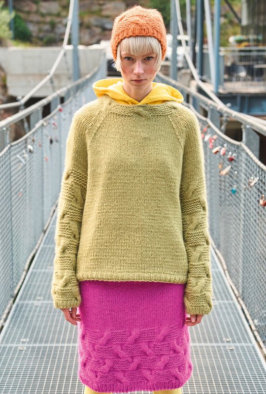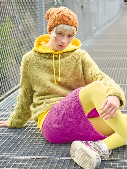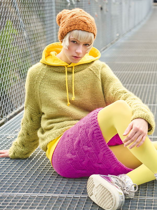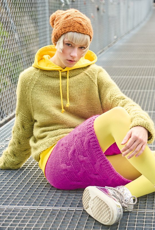 Die neue Farbpalette spielt mit lauten und leuchtenden Tönen. Bei diesem Ensemble aus dickem Schurwoll-Alpakagarn ist es heiteres Limone, das wir für den Raglanpulli mit Passe verwendet haben. In krnalligem Fuchsia begeistert der schmal geschnittenen Minirock und leuchtendes Orange ist der frechen Mütze mit selbstgemachtem Pompon vorbehalten. Alle drei Teile erregen aber erst im Zusammenhang Aufsehen, da die markanten Zopfstrukturen mal partiell, mal allover zum Einsatz kommen.