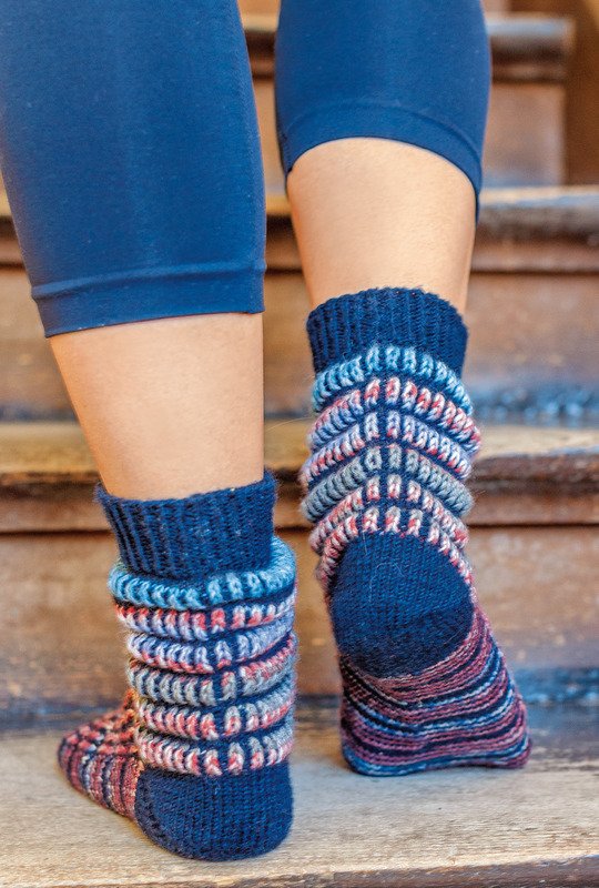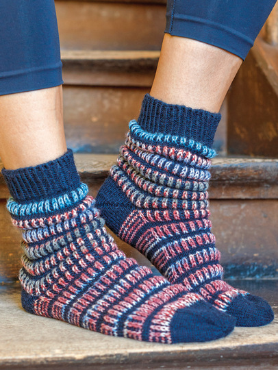 Das Muster dieser gestrickten blau-bunten Socken ist ein echter Hingucker: das Patentrippenmuster lässt den Strumpf voluminös erscheinen, die verschiedenen Farben der superweichen und pflegeleichten Wolle Hot Socks Pearl color in Circus-Mix im Wechsel mit uni Marine lassen ein Art Streifendesign erscheinen. Außer in dieser fröhlichen Farbkombi gibt es die Wolle noch in drei weiteren Mix-Varianten und weiteren 15 Uni-Varianten, da ist für jeden Geschmack etwas dabei. Das Nachstricken der Socken ist dank der ausführlichen Anleitung auch für ungeübtere Strickerinnen kein Problem.