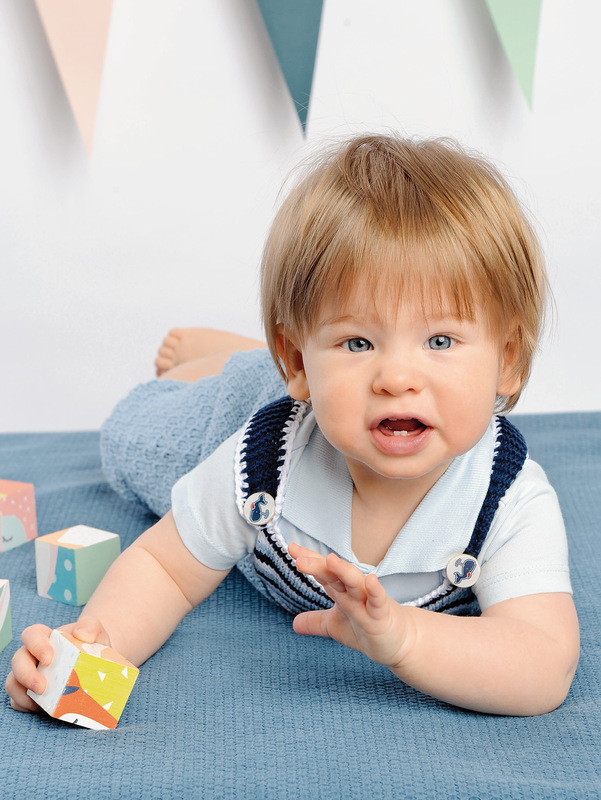 Für die ersten Aktivitäten kommt dieser niedliche Anzug gerade recht. Die Hose, deren unterer Teil in einem Würfelmuster gestrickt wird, hat einen glatt rechts gestrickte Latz in dreifarbigem Streifenmuster in Marine, Hellblau und Weiß und kraus rechts gestrickte Träger in Marine, deren Ränder mit festen Maschen in Weiß umhäkelt sind. Eine farblich passende Jacke wird in einem gestreiften Hebemaschenmuster in den Streifenfarben der Hose gearbeitet und hat im großen Perlmuster gestrickte Bündchen und Blenden in Marine. Die Anleitung ist für die Größen 62 – 68, 74 – 80 und 86 – 92 vorhanden.