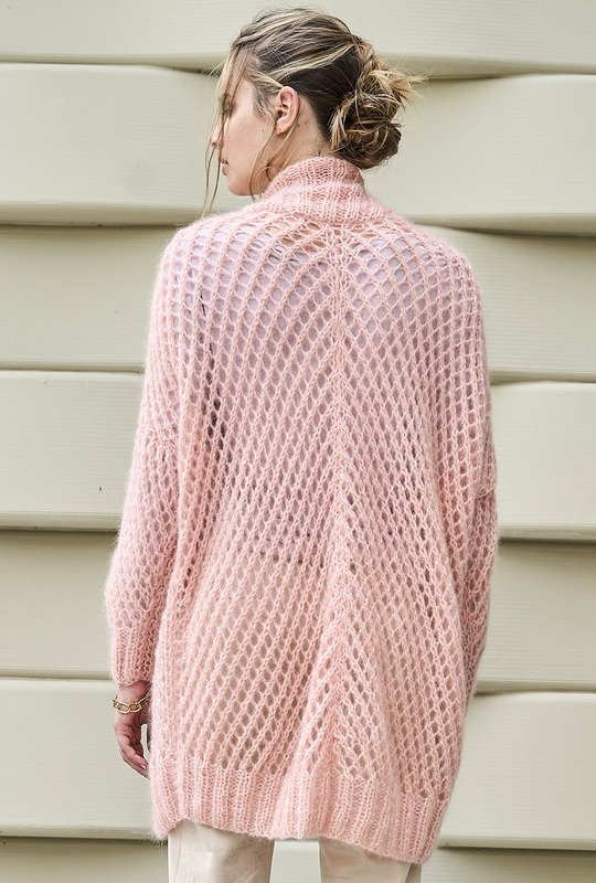 In diesem Winter werden die Garne noch weicher, noch kuscheliger. Schönster Beweis ist die locker fallende Jacke, deren transparente Netzstrukturen von breiten Rippenblenden eingerahmt werden. Das flauschige Mohair-Seidengarn wird in Lachs und Rosa vierfädig, das heißt 2 Fäden pro Farbe, verstrickt – mit Nadeln Nummer 8 geht dadurch die Arbeit flott von der Hand und der Wärme-Effekt ist garantiert. Tipp: Wer die verschlusslose Form nicht mag, nimmt einfach einen Gürtel und bringt damit alles schön auf Taille.
