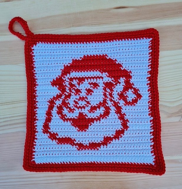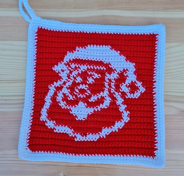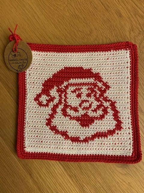 Mit der von mir verwendeten Wolle hat der Topflappen eine Größe von ca. 20cm x 20cm.
