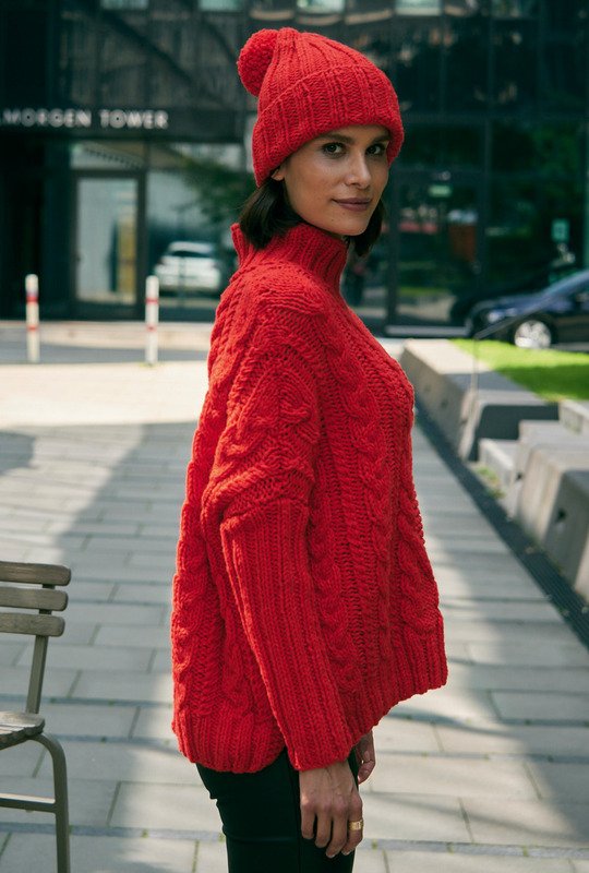 Das Set in oversized geschnittenem extraweitem Pullover mit Aranmuster und einer Bommel-Mütze, ist perfekt für kalte Tage geeignet. Der Pullover strahlt nicht nur in leuchtendem Rot, sondern zieht mit dem Kontrast der dreidimensionalen Aranzöpfen und Rippenmusterstrukturen die Blicke auf sich. Das dicke, leuchtend rote Schurwolle-Polyacryl-Garn wird mit 8er-Nadeln verstrickt. -Die schmalen Ärmel sind ganz im Rippenmuster 2 rechts, 2 links gearbeitet, genauso wie die Mütze mit Pompon. Die Anleitung dafür kann für die Größen 40/42, 44/46 und 48/50 downgeloadet werden.