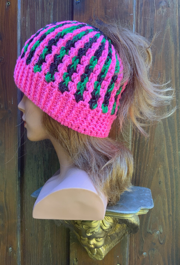 Mütze MOGLI geschlossen & für den Pferdeschwanz...die Mütze kann man eben praktischerweise auf 2 Arten oben am Kopf schließen: verschlossen oder mit einem etwas größeren Loch z. B.: für den Pferdeschwanz. Auch ein Beanie ist so einfach zu häkeln!