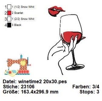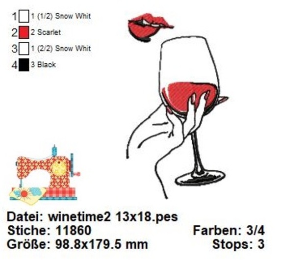 Mit dieser Stickdatei können Sie den Genuss und die Verführung in Ihre Projekte einweben und eine Atmosphäre der Entspannung und des Luxus schaffen. Sie ist wie ein Toast auf die feineren Dinge im Leben!