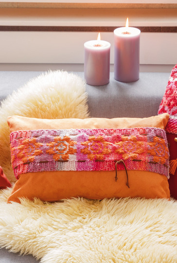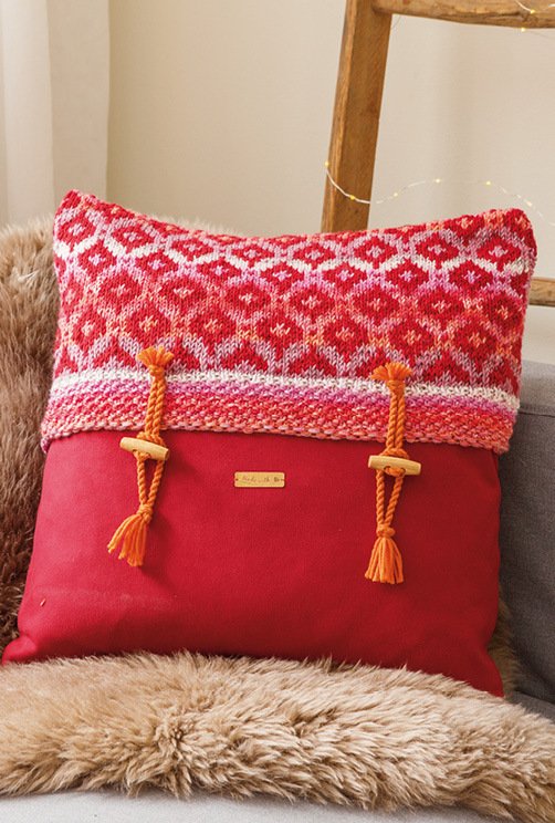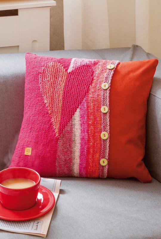 Mit solch ausgefallenen Kissen mit einer Kombi aus 100 % Schurwolle und Stoff lässt es sich besonders gut auf dem Sofa chillen und auch optisch sind sie ein Hingucker! Gestrickt wird mit dem Garn „Cool Wool Big Color" von Lana Grossa aus, kombiniert wird es mit Möbelstoff aus Microfaser-Velour. Für modische Akzente sorgen Velour-Lederbänder, ein eingestricktes Herzmotiv und eine Knopfleiste.