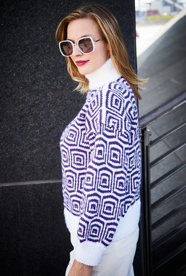 Der Stil des Pullis aus Polyacryl-Schurwolle-Mischgarn ist inspiriert von den opulenten Tapeten- und Stoffmustern der Siebziger. Durch das strahlende Weiß der Bündchen und des Rollkragens bekommt der Look ein cleanes Upgrade. Das versetzte Karo-Streifen-Muster entsteht durch Hebemaschen, die raffiniert ineinandergreifen, denn es müssen immer nur je zwei Reihen in ein und derselben Farbe gestrickt werden – mal Weiß, mal Lila. Alle Teile sind ganz gerade geschnitten, dadurch hängen die Schultern ganz leger über. Eine Anleitung ist für die Größen 38/40, 42/44 und 46/48 vorhanden.