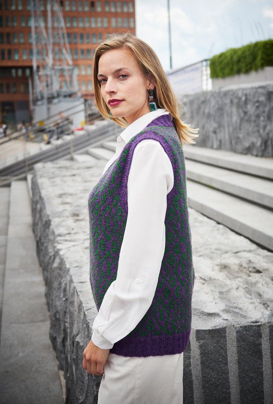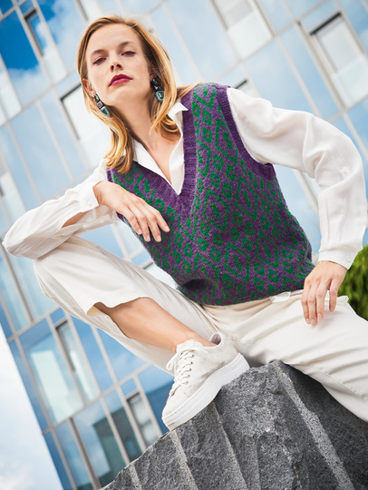 Der Klassiker schlechthin: ein Pullunder mit V-Ausschnitt. Ein topaktuelles Garderobenteil im College-Stil mit tiefem V-Ausschnitt wird in sattem dunklem Grün und aristokratischem Violett gearbeitet. Das rautenförmige Jacquardmuster wirkt very british. Dazu passt auch das Garn aus einer Mischung von Schurwolle, Alpaka und etwas Polyamid. Für Bund, Arm- und V-Ausschnittblenden werden violette Rippen 2 rechts, 2 links gestrickt. Der Pullunder sollte locker fallen und die Taille nicht betonen. Zum Download steht die Anleitung in den Größen 36/38, 40/42 und 44/46 bereit.
