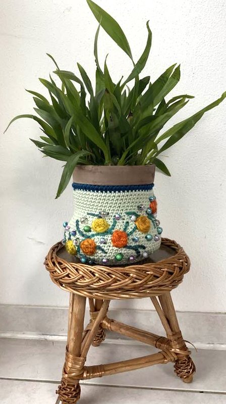 Vase + Utensilo + Übertopf Blümchen....ganz bezaubernd....ein echt tolles Geschenk und Mitbringsel...auch toll für Deine Häkelnadeln...oder praktisch im Badezimmer für Bürsten + Kämme u.v.m.....Der Übertopf ist richtig schön stabil!.....und mit einem Glas in der Mitte auch ein hübsche Vase