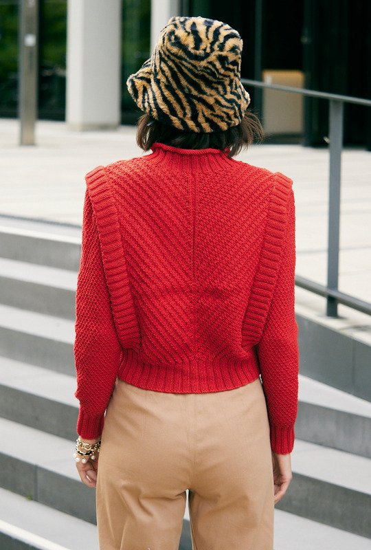 So vielfältig wie bei diesem taillenkurzen Pullover aus reiner Schurwolle sieht man Rechts-Links-Muster selten: An den Seiten verlaufen die Rippen quer, in der Mitte schräg nach oben und beim Bund, der Halsausschnittblende und den längs angebrachten Rippenblenden als 2/2-Rippen. Die Ärmel sind bis auf den Bund im großen Perlmuster – also ebenfalls ein Rechts-links-Muster – gearbeitet. Die über die Schulter hinweg angestrickten breiten Rippenblenden verdeckten die Armkugeln, die für die perfekte Passform des Pullis an den Schultern sorgen. Eine Anleitung dazu steht in den Größen 36/38, 40/42 und 44/46 zur Verfügung.
